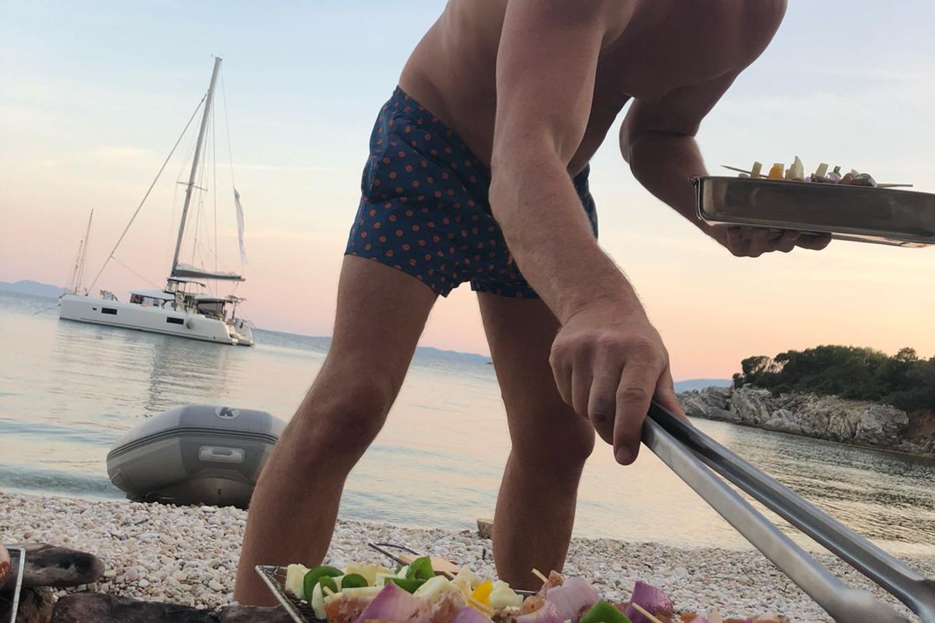 Wenn wir zurück nach Lefkas segeln, halten wir in der geschützten Bucht von Ormos Vrako auf dem Festland. Es gibt eine lebhafte Strandbar, in der Sie Musik genießen und im seichten Wasser schwimmen oder schnorcheln und die Felsen und die umliegenden Buchten erkunden können. Manchmal bedeutet "in Griechenland segeln", mit einem Cocktail am Strand zu liegen.
