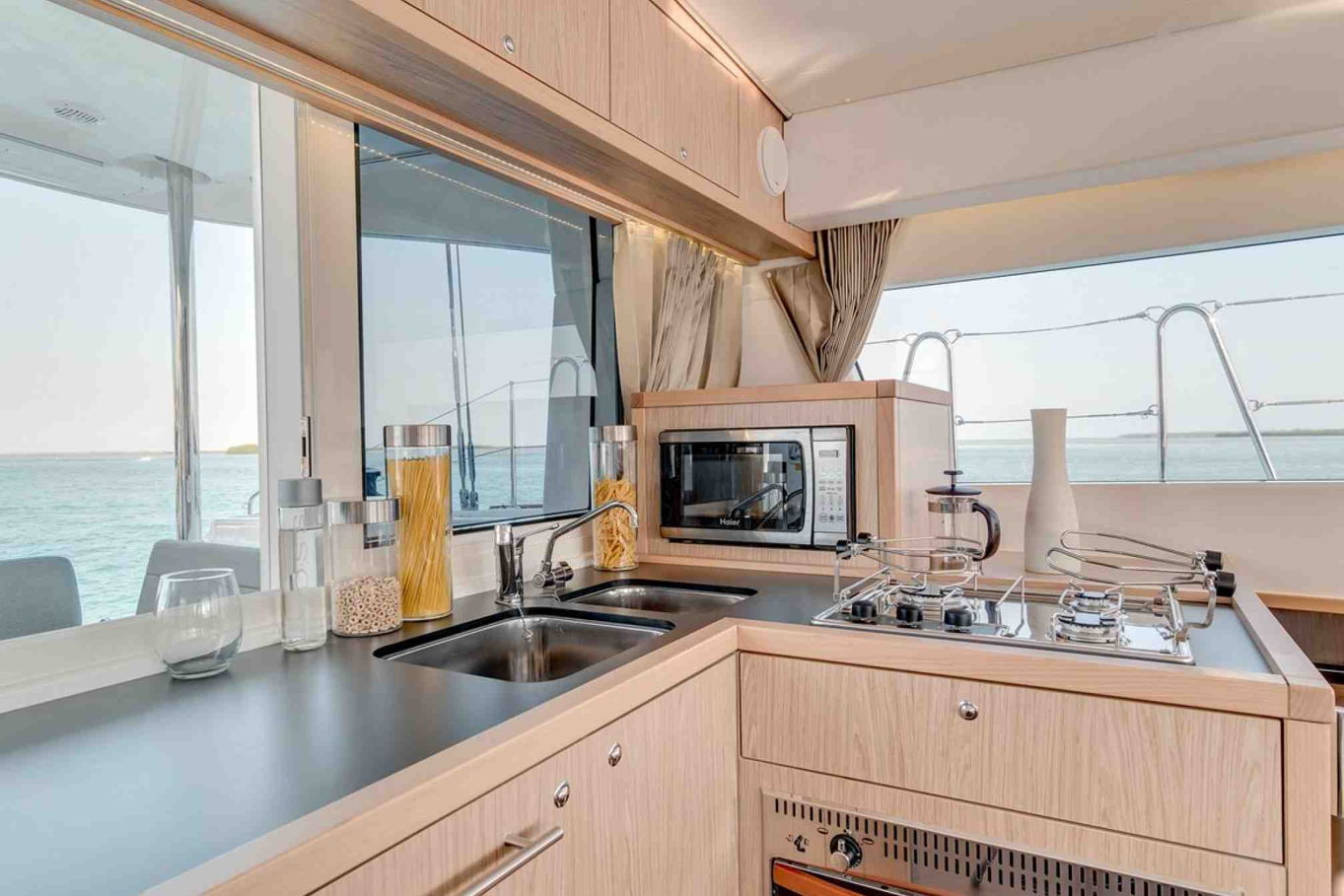 There are four double-bed cabins, two single cabins at the bow of the boat and for voyages to all destinations with the exception of Martinique, two guests can also sleep comfortably in the parlour. The single cabins are designated for the captain and the hostess but if you decide to set out without a crew (you can also hire this boat as bareboat charter), you can use these cabins for guests.