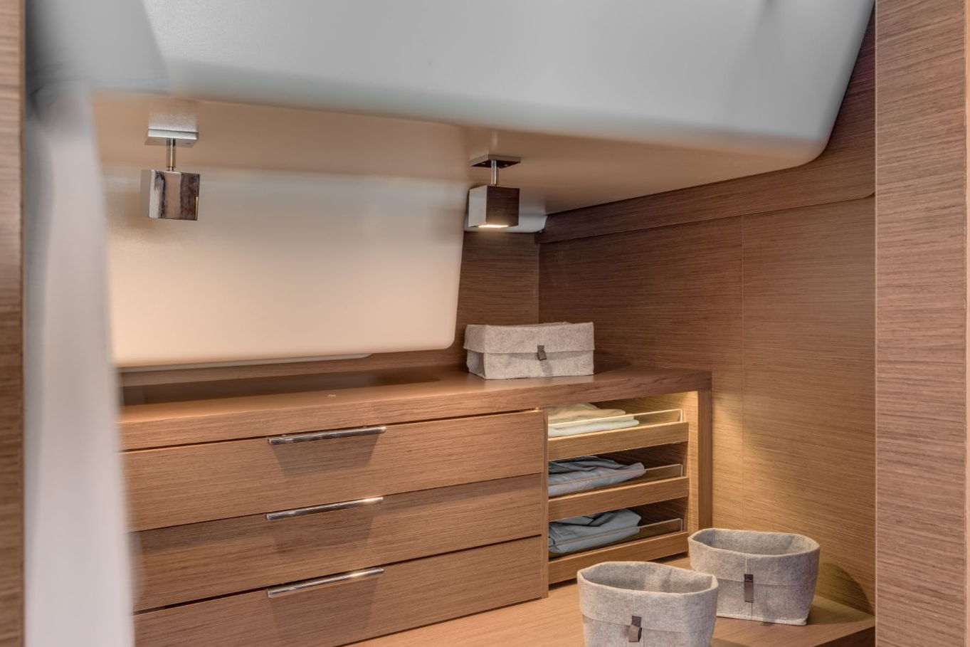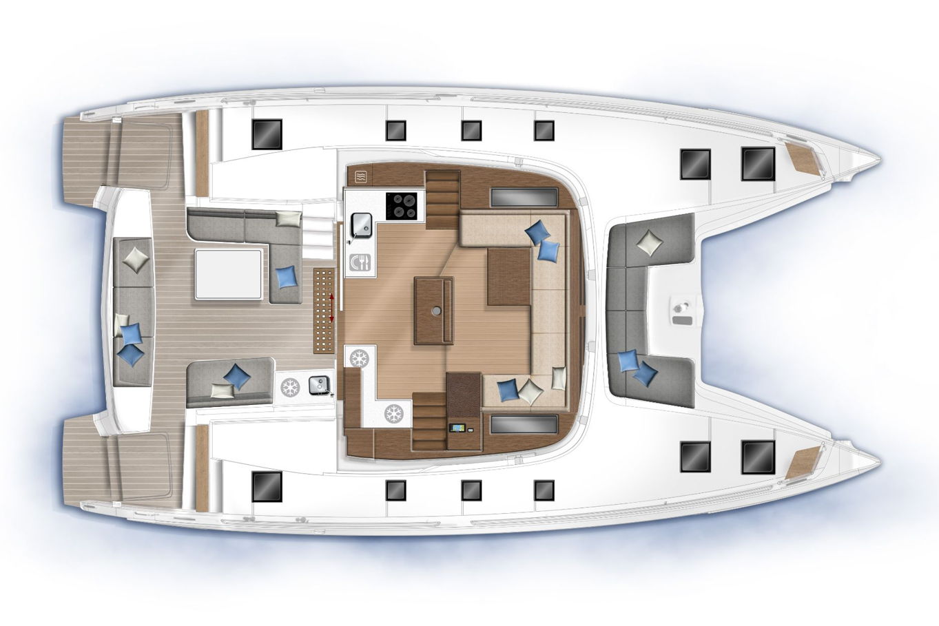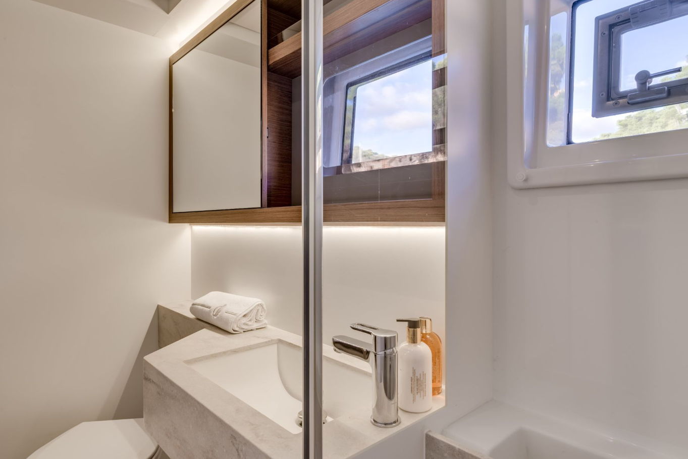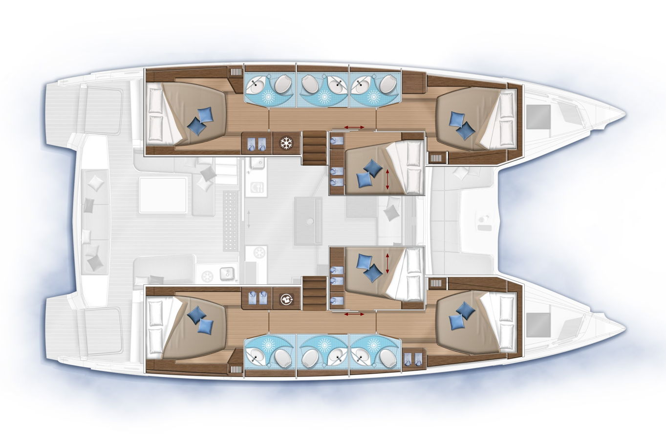 Lagoon 50 is perfect for a holiday with your family or a group of friends. Let lull yourselves by a calm sway of waves to a night of sleep in 6 spacious double-bed cabins furnished with enough storage space. Moreover, 4 of them is equipped with private bathrooms. Captain’s cabin is located in the front part of the catamaran, hence your privacy is not disturbed by anyone. For those who choose a holiday in a group of 8, there is a possibility to rent a 4-cabins version.