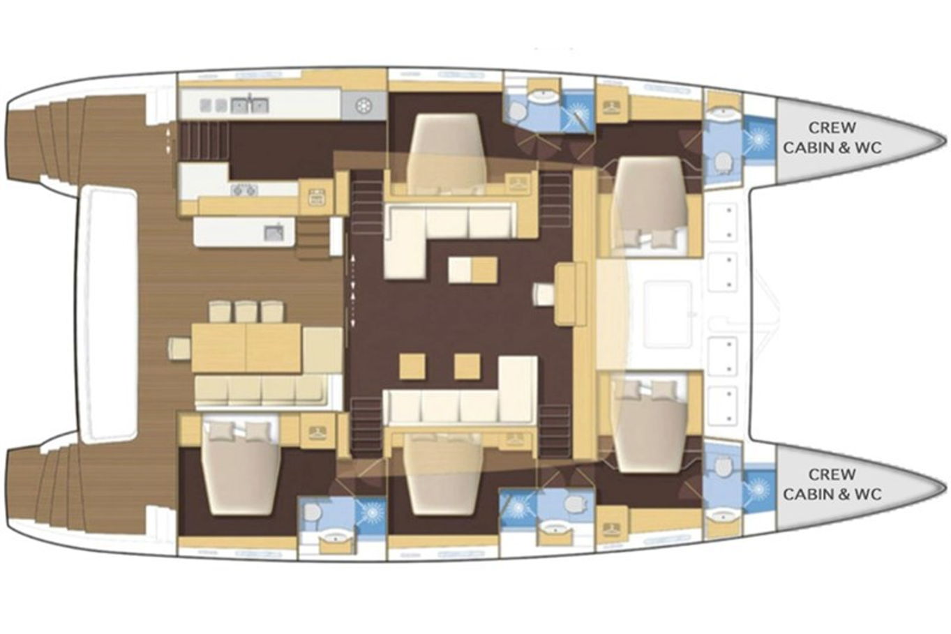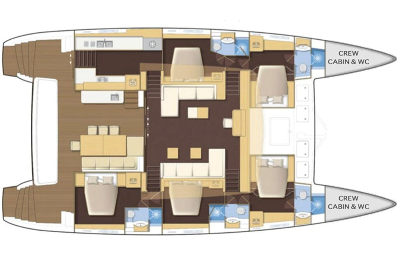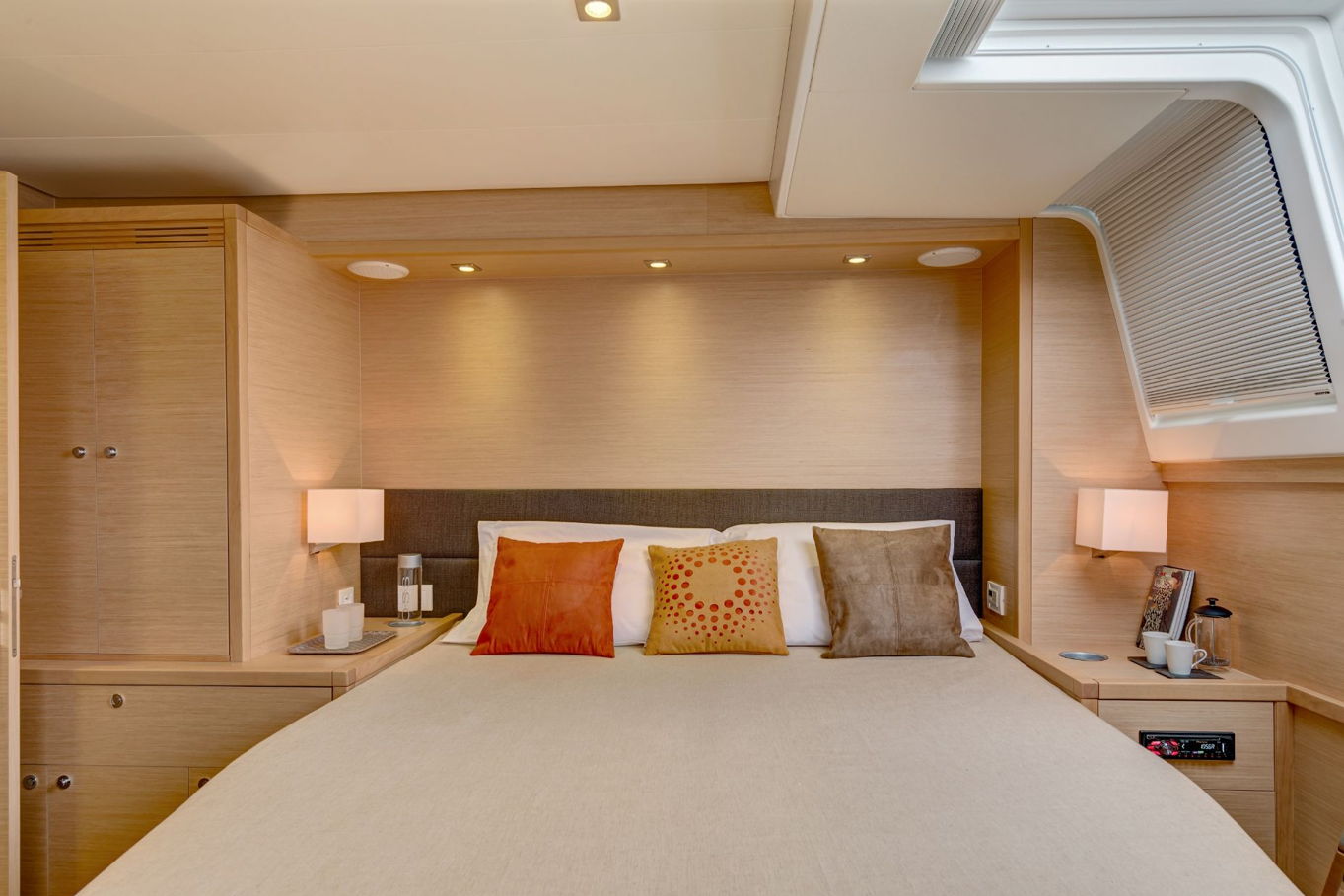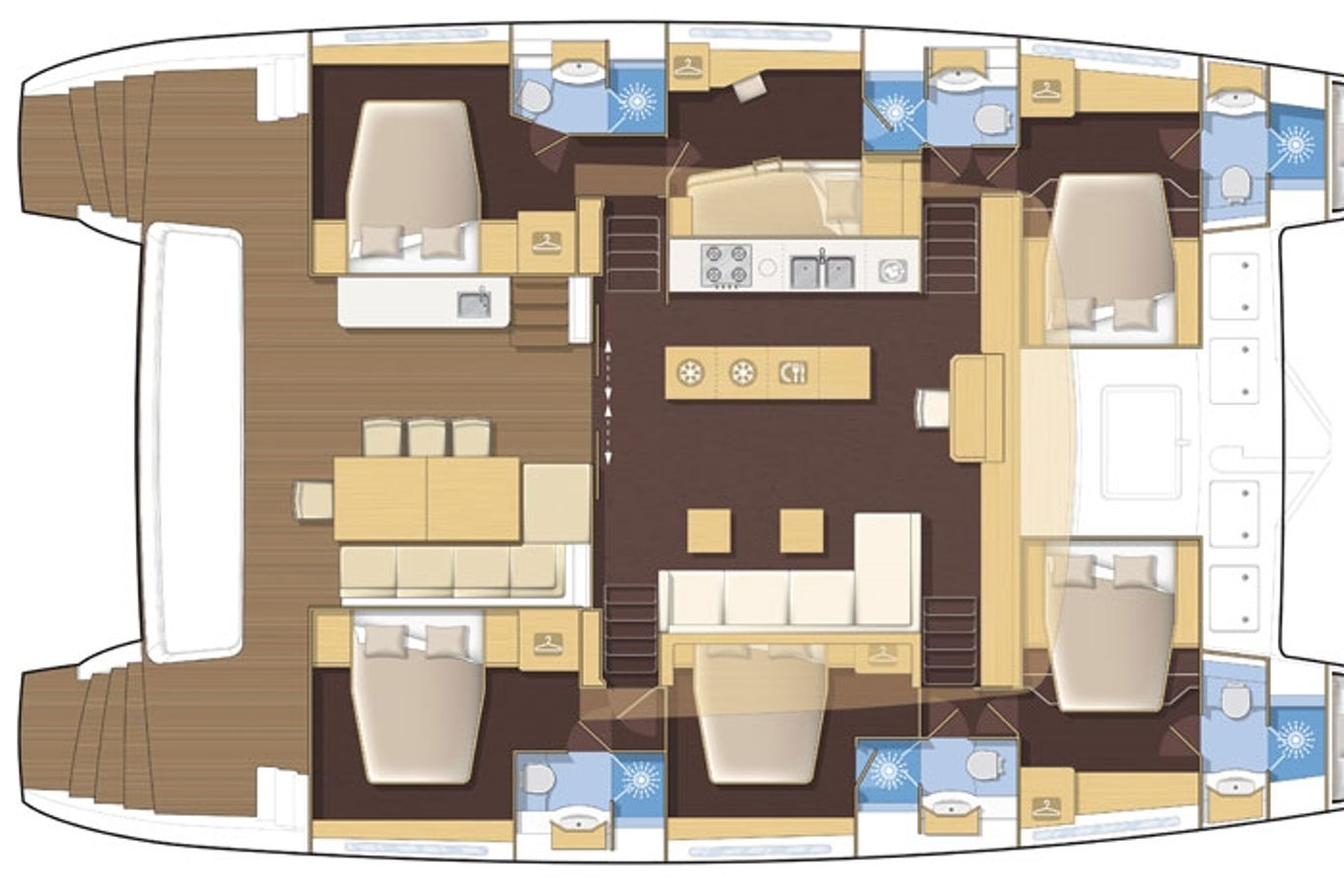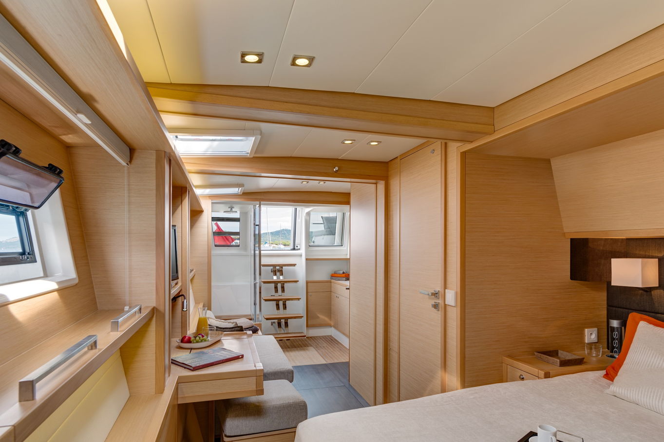 The Lagoon 620 houses up to ten people within five double bed cabins. (For a cruise in Croatia it is available in a six cabin option that accommodates up to twelve people). All rooms have VIP size cabins, a double bed and an en suite bathroom with a separate shower corner and toilet. The cabins offer a room comparable to a hotel with an office desk. The speciality of this catamaran is the double entrance to the rear cabins - you can either gain access to them via the stairs from the salon or by the huge rear windows that can be pushed aside and lead directly outside on the rear of the boat. From this position it is just a few steps away from the sea.