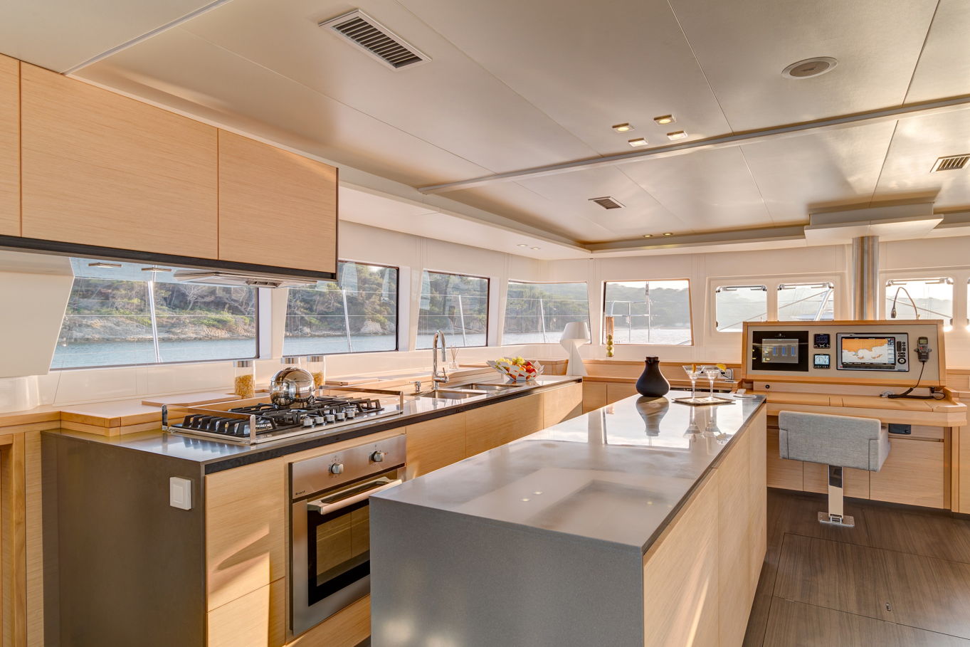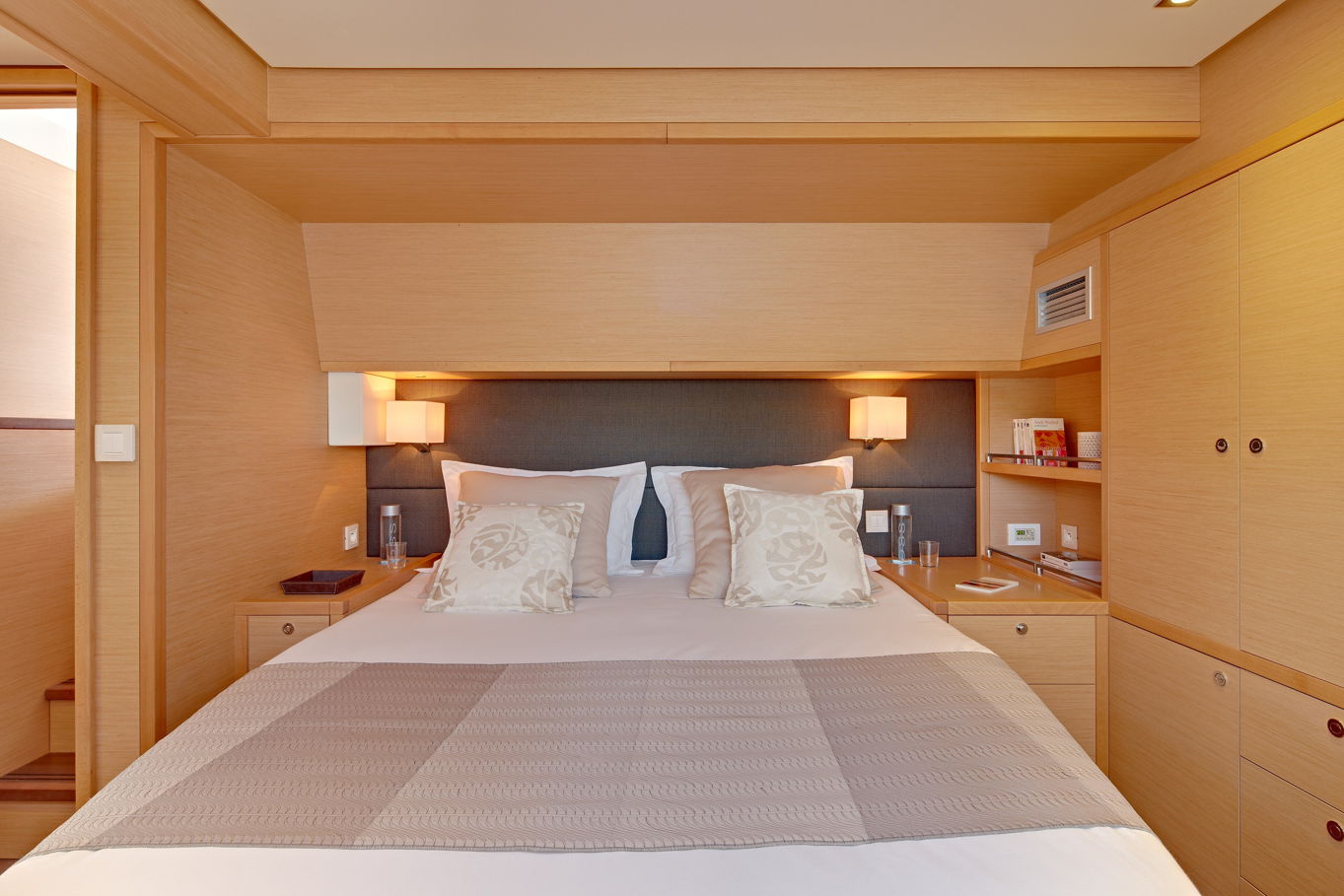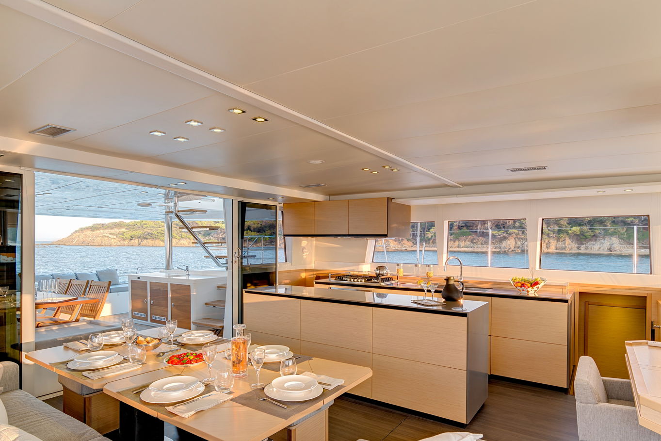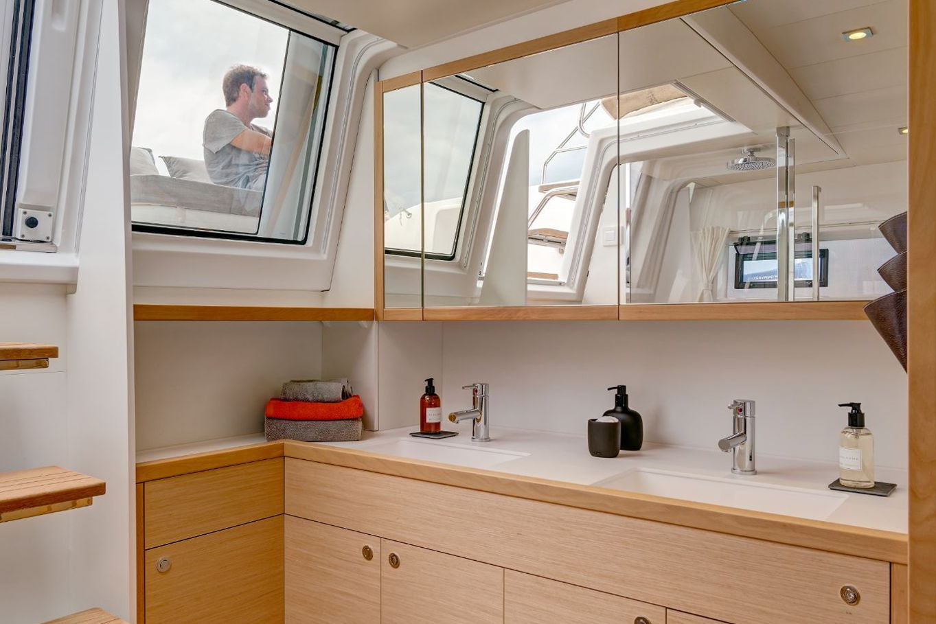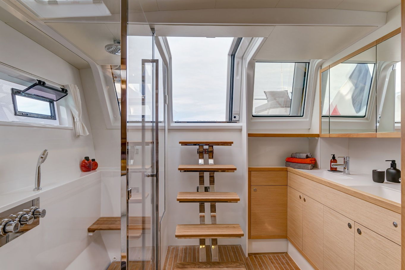 The Lagoon 620 houses up to ten people within five double bed cabins. (For a cruise in Croatia it is available in a six cabin option that accommodates up to twelve people). All rooms have VIP size cabins, a double bed and an en suite bathroom with a separate shower corner and toilet. The cabins offer a room comparable to a hotel with an office desk. The speciality of this catamaran is the double entrance to the rear cabins - you can either gain access to them via the stairs from the salon or by the huge rear windows that can be pushed aside and lead directly outside on the rear of the boat. From this position it is just a few steps away from the sea.