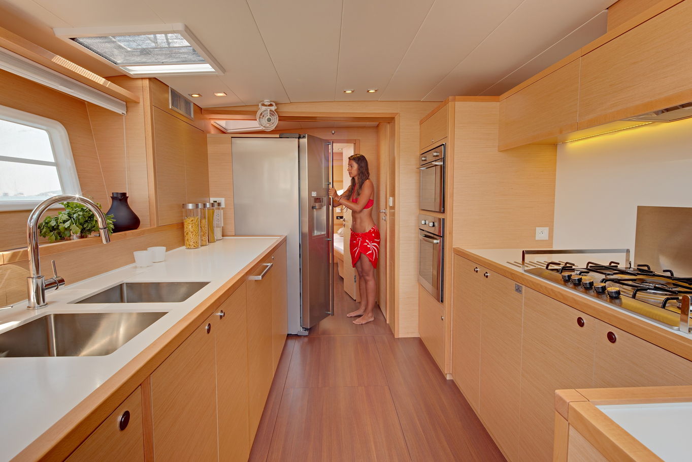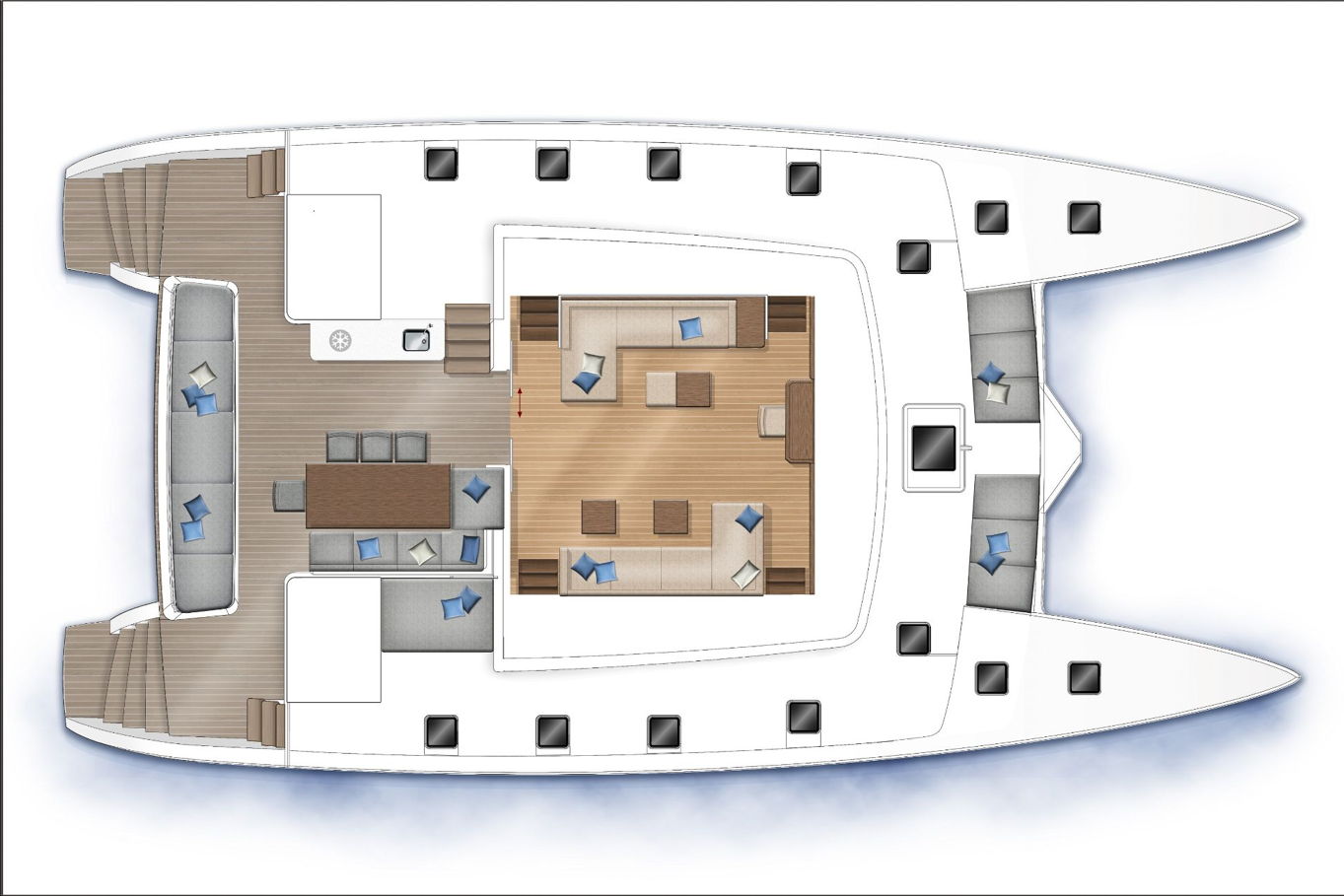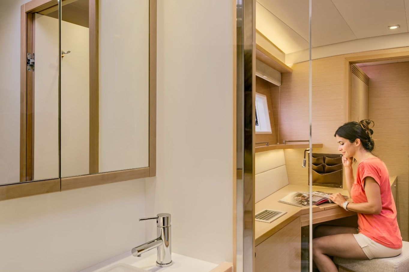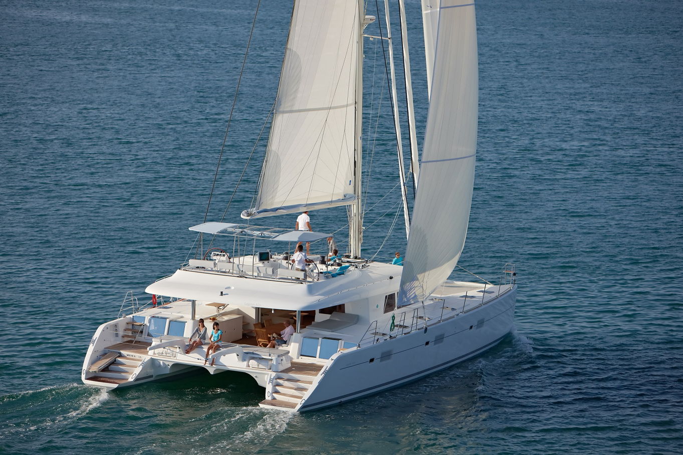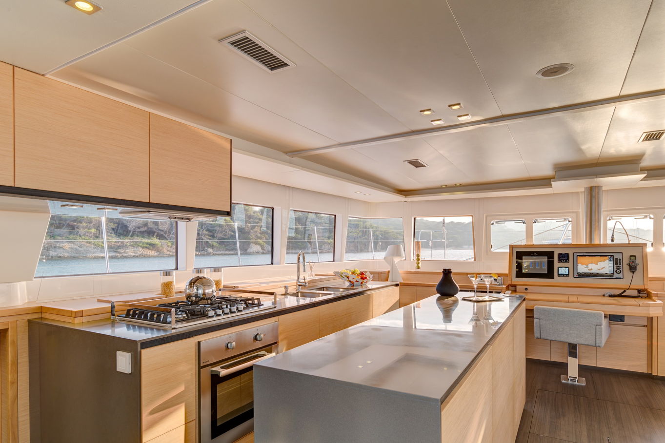The Lagoon 620 houses up to ten people within five double bed cabins. (For a cruise in Croatia it is available in a six cabin option that accommodates up to twelve people). All rooms have VIP size cabins, a double bed and an en suite bathroom with a separate shower corner and toilet. The cabins offer a room comparable to a hotel with an office desk. The speciality of this catamaran is the double entrance to the rear cabins - you can either gain access to them via the stairs from the salon or by the huge rear windows that can be pushed aside and lead directly outside on the rear of the boat. From this position it is just a few steps away from the sea.