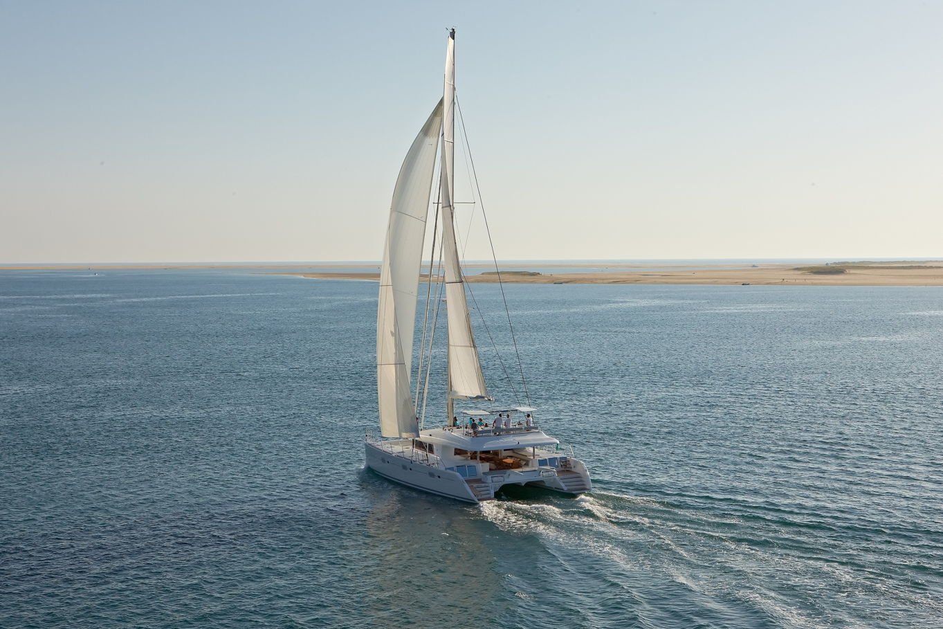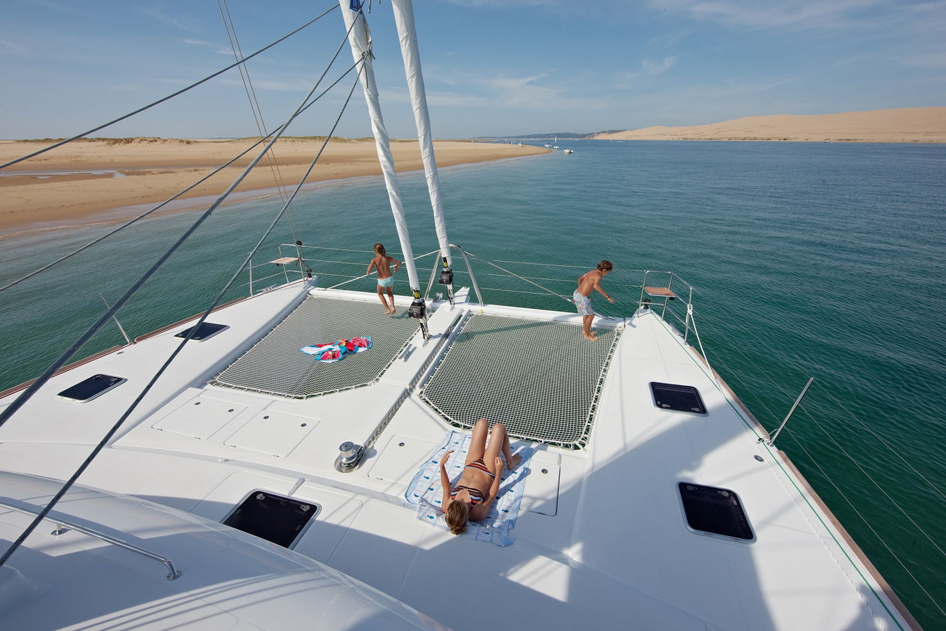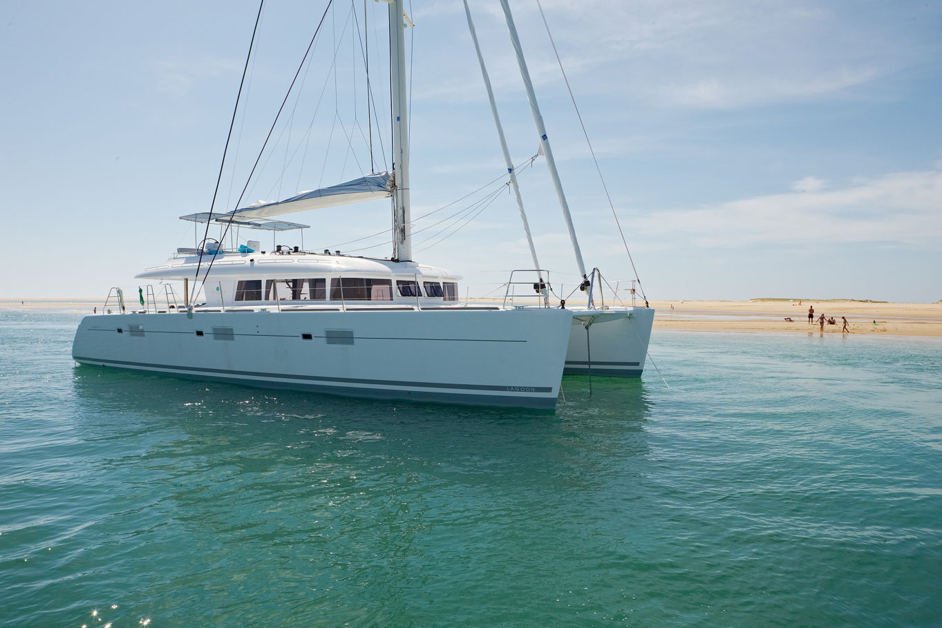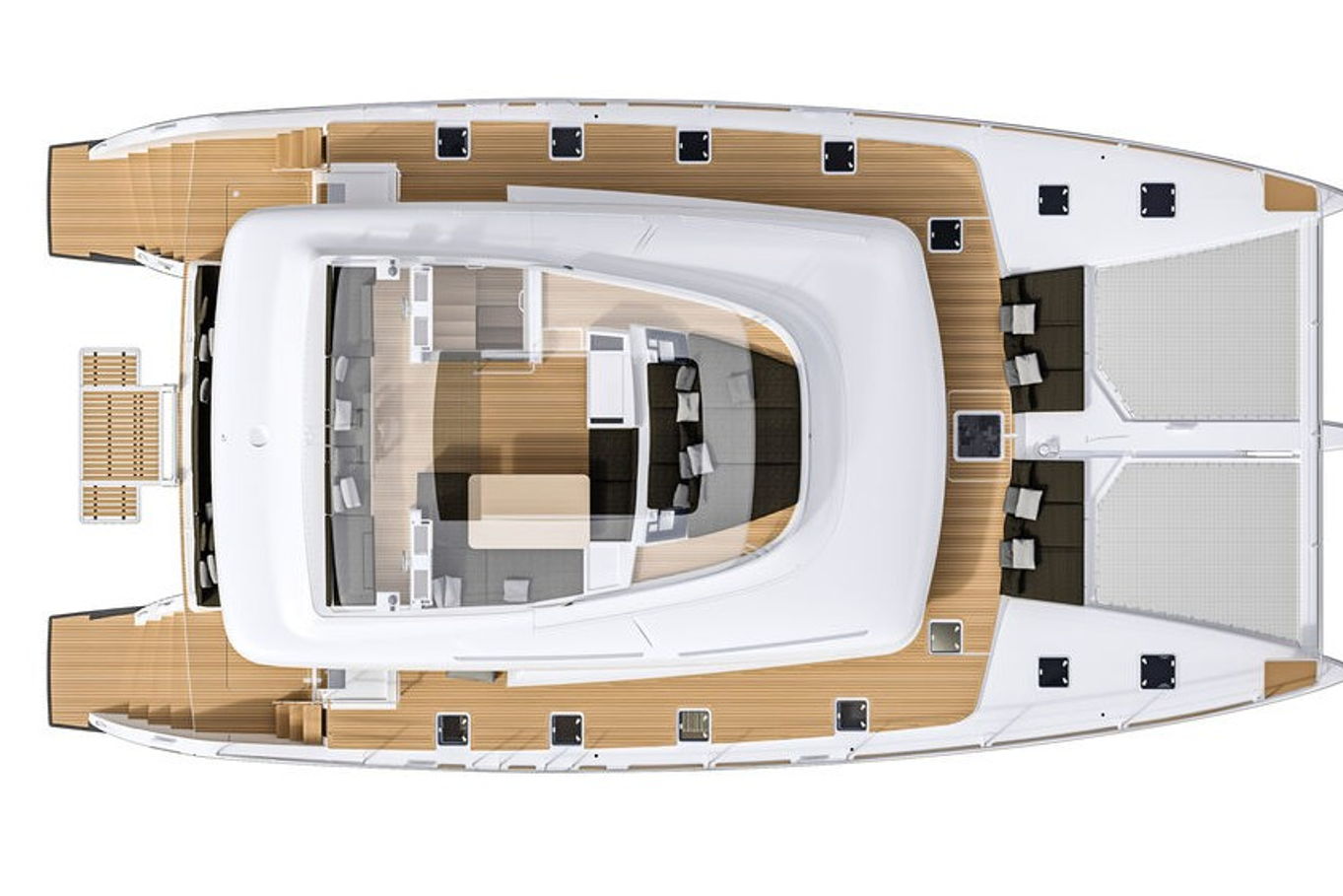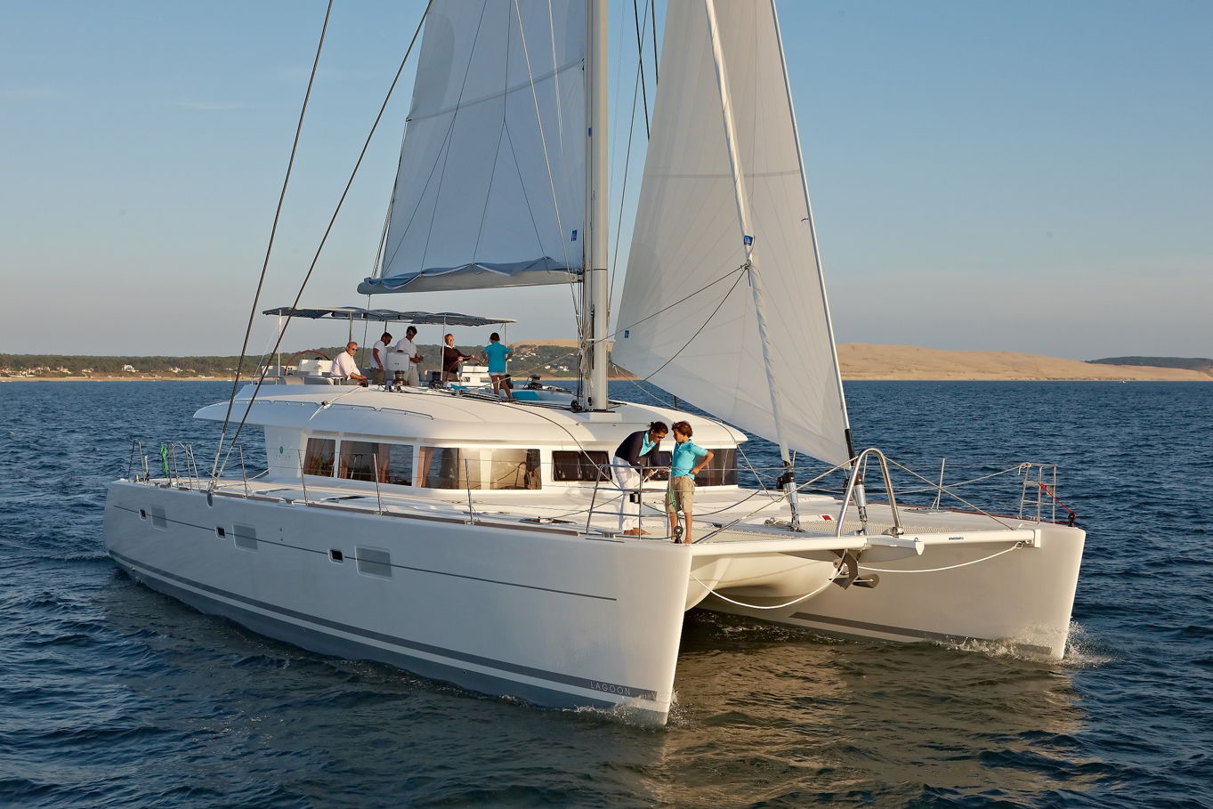 The Lagoon 620 houses up to ten people within five double bed cabins. (For a cruise in Croatia it is available in a six cabin option that accommodates up to twelve people). All rooms have VIP size cabins, a double bed and an en suite bathroom with a separate shower corner and toilet. The cabins offer a room comparable to a hotel with an office desk. The speciality of this catamaran is the double entrance to the rear cabins - you can either gain access to them via the stairs from the salon or by the huge rear windows that can be pushed aside and lead directly outside on the rear of the boat. From this position it is just a few steps away from the sea.