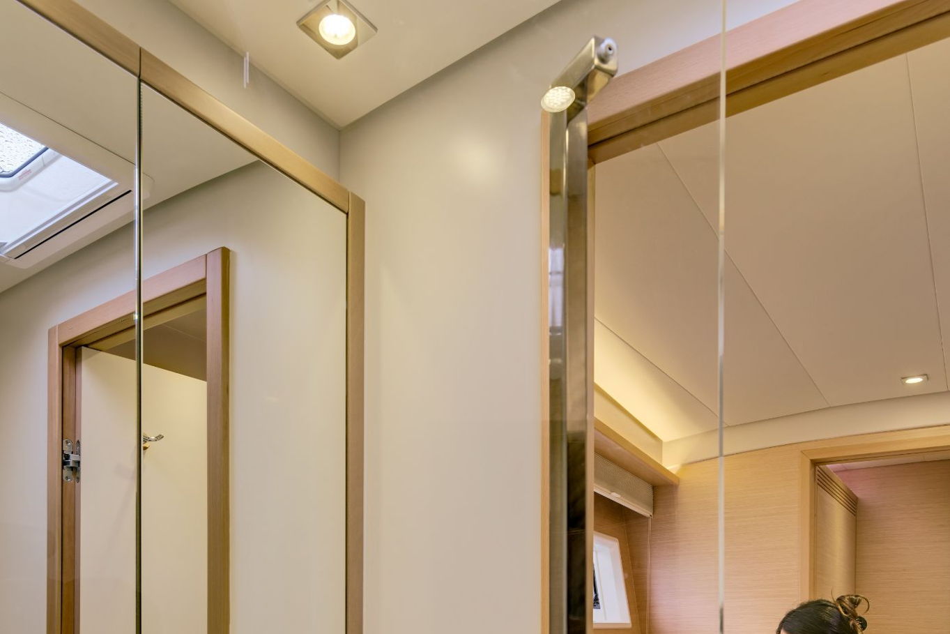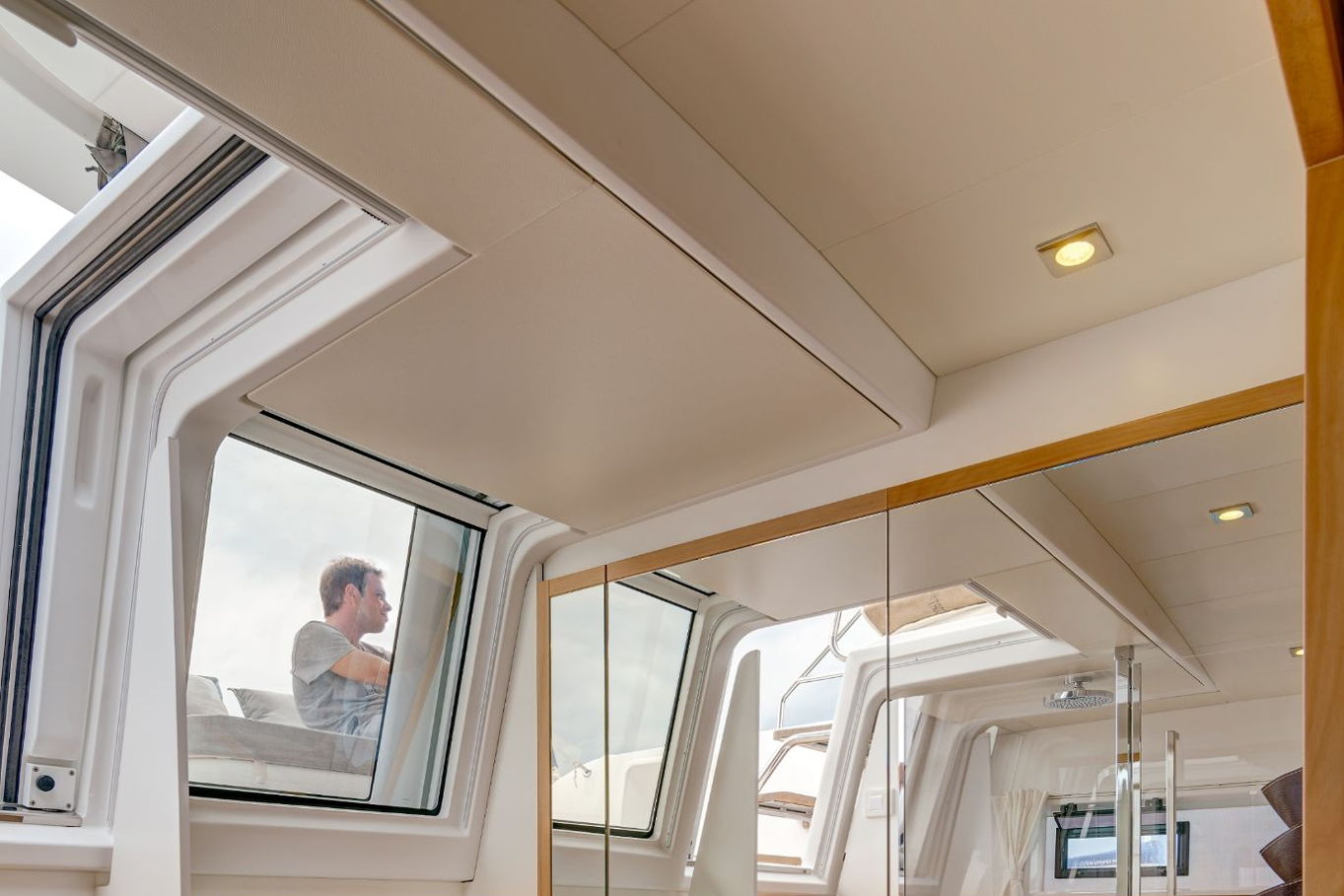 In the middle of the boat there is a huge salon with a fully equipped kitchen, a dining table and a living area. From the salon the large windows have a wonderful view of the surroundings and thanks to the sliding door you can easily connect with the outdoor seating area at the back of the boat to enjoy breakfast or lunch. Depending on your mood you can choose to sit either inside the salon or outside in the fresh air.
