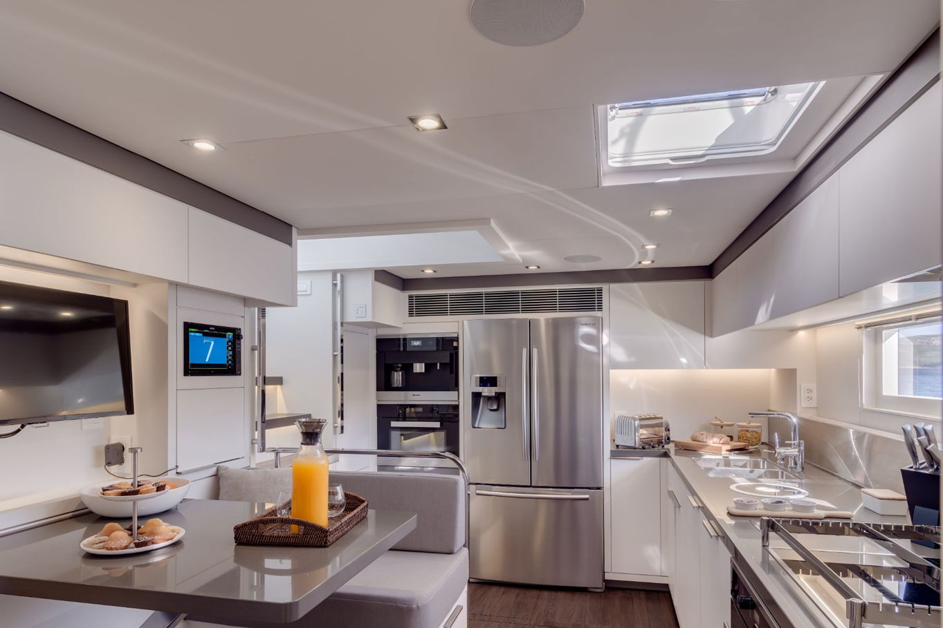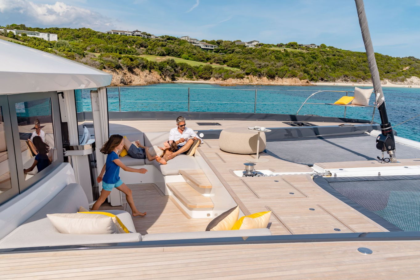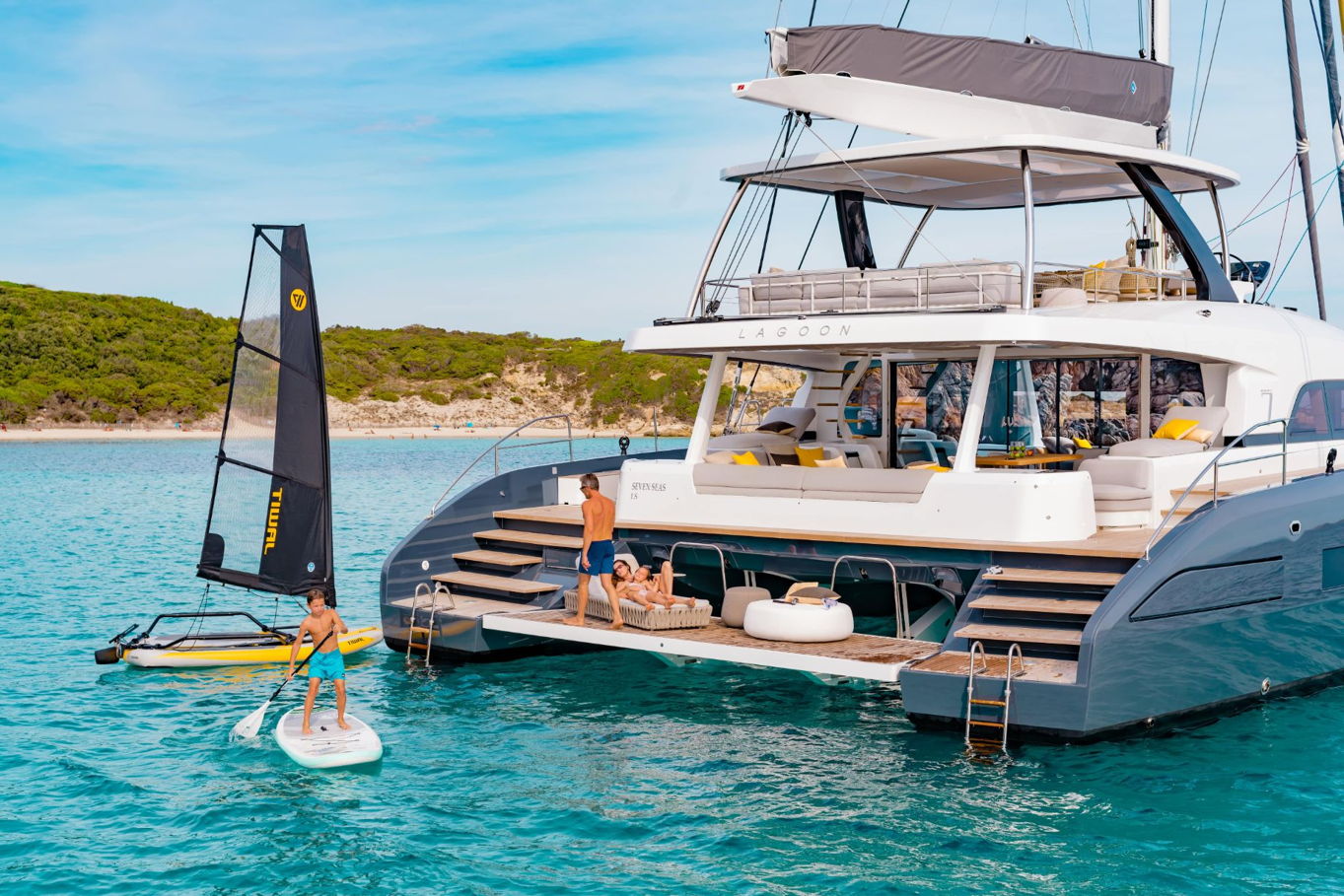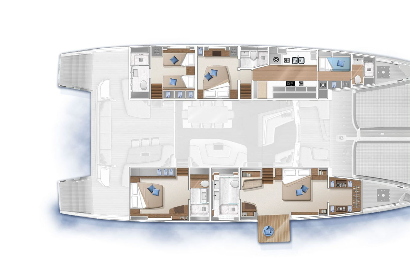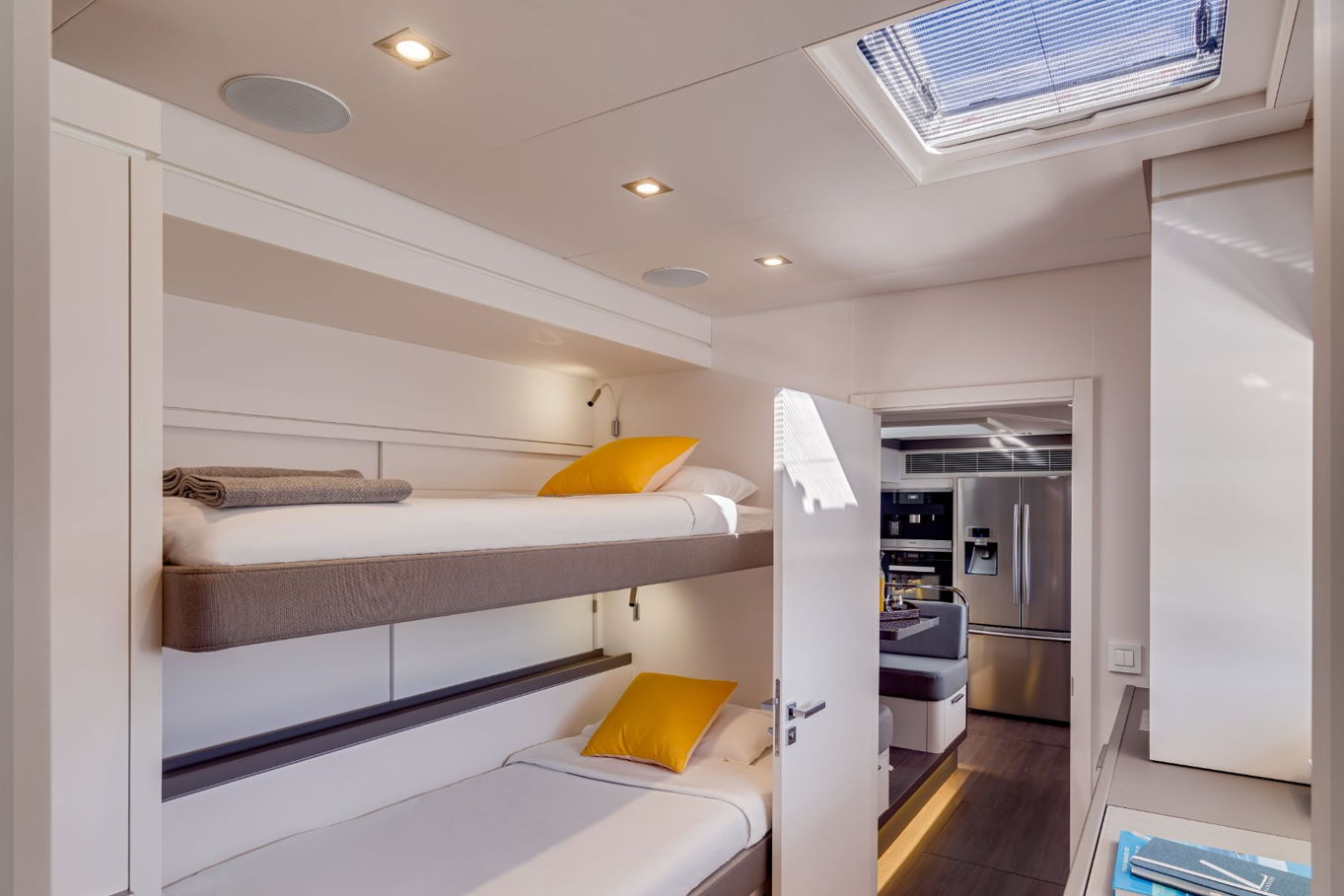 The spacious common salon is characteristic by its big and thoughtfully located windows, which provide you with an amazing panoramic view, therefore, you can enjoy a perfect experience even from the inside of the boat. Do you plan to spend a cruise with your family and be sure that your children have the best time as well? The prow of this beautiful catamaran is equipped with modern trampolines that doubtlessly entertain (not only) the children’s part of your crew. Stop dreaming about a perfect holiday, experience it with the Lagoon Seventy 7.