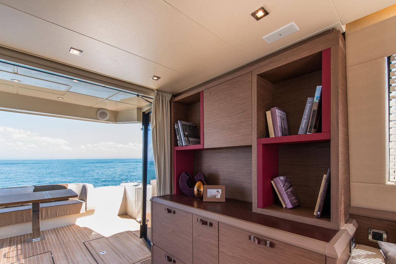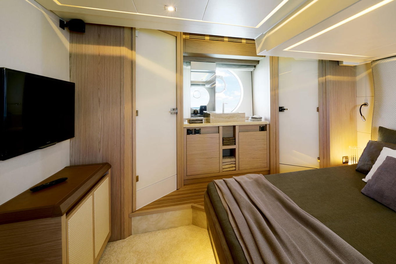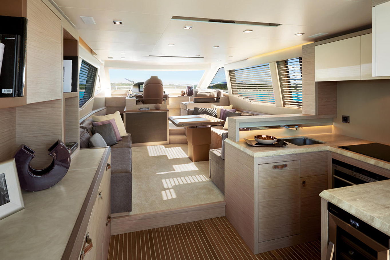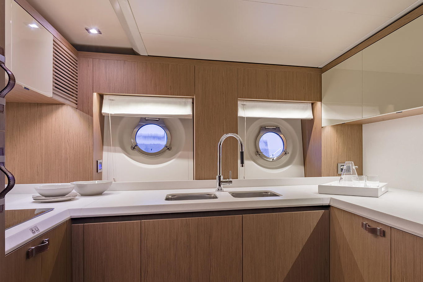 Top quality materials and detailed finishes offer a unique lifestyle for a motor cruiser this size. The interior boasts a spacious and open design, seamlessly connecting the galley at the centre of the boat with the huge lounge and central steering station.