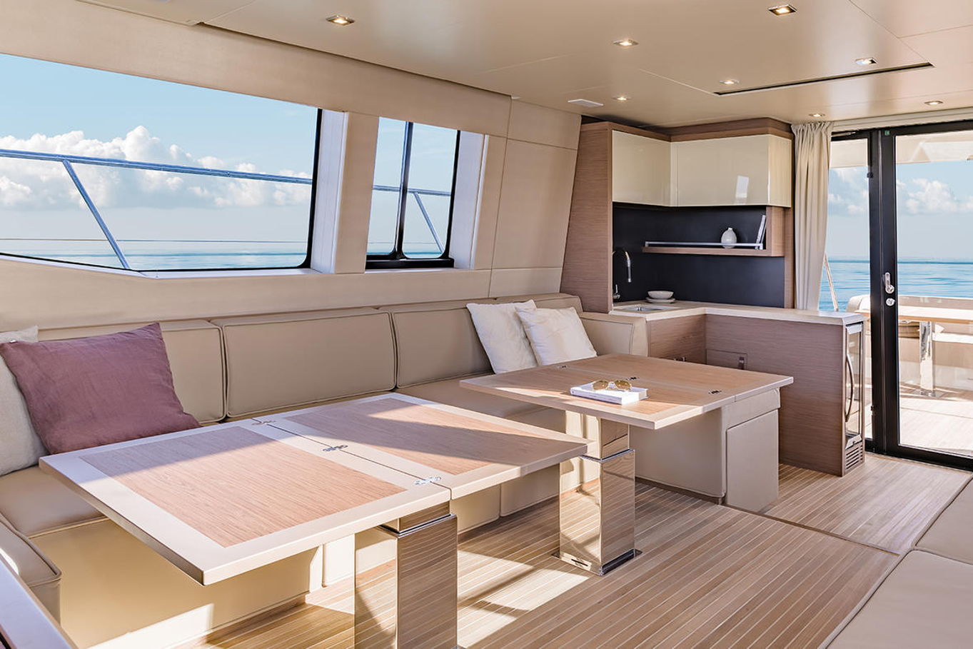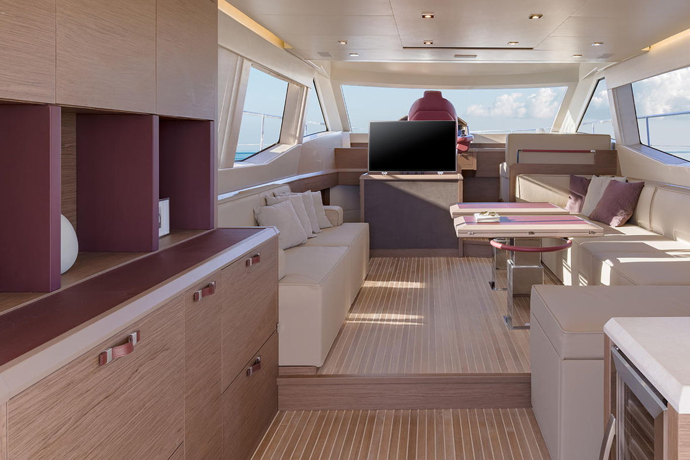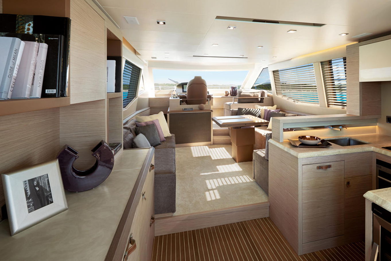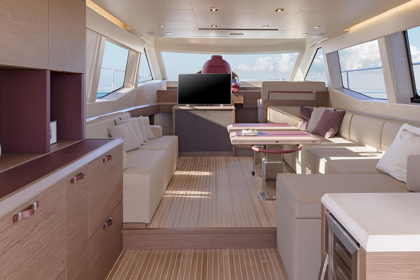 Top quality materials and detailed finishes offer a unique lifestyle for a motor cruiser this size. The interior boasts a spacious and open design, seamlessly connecting the galley at the centre of the boat with the huge lounge and central steering station.