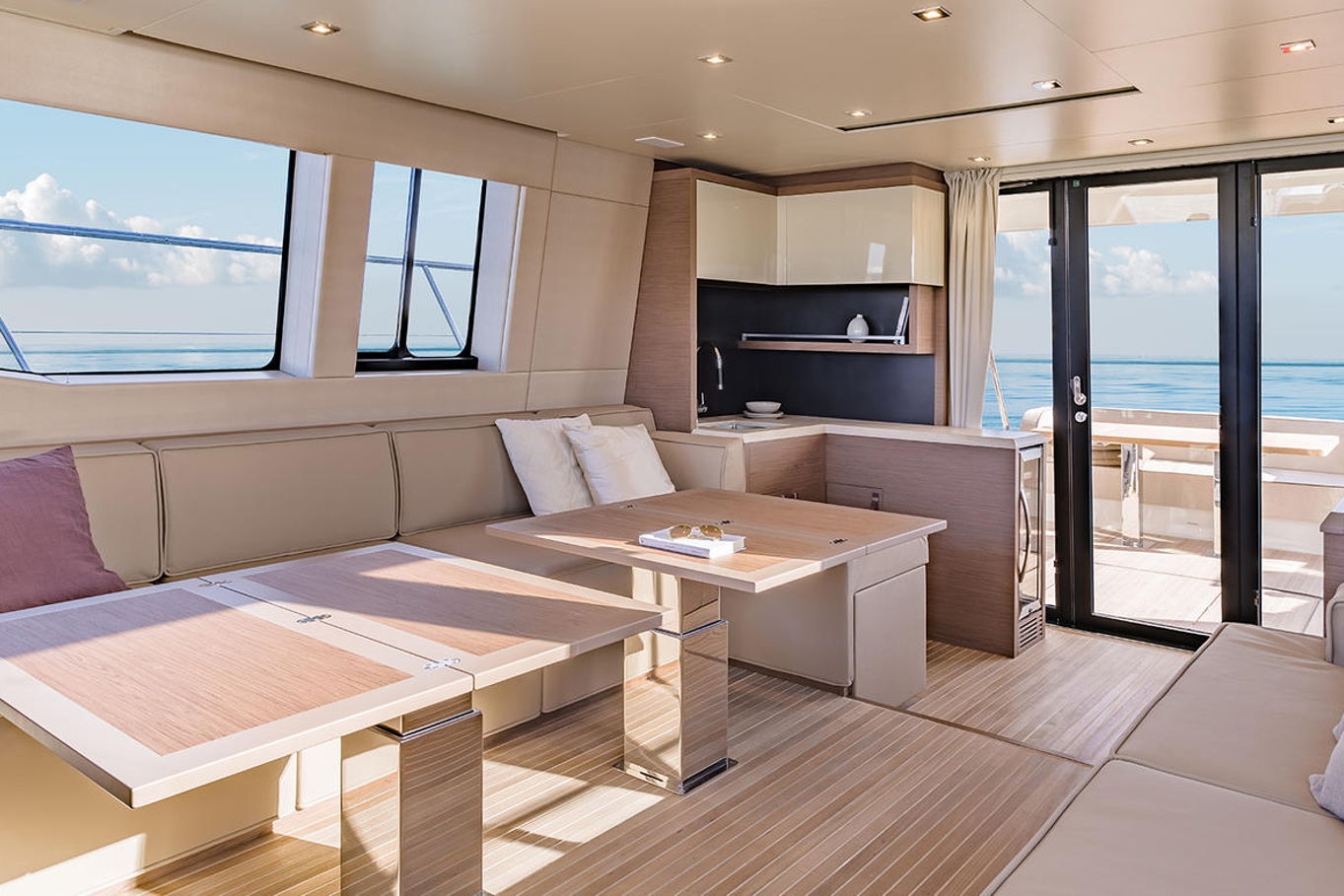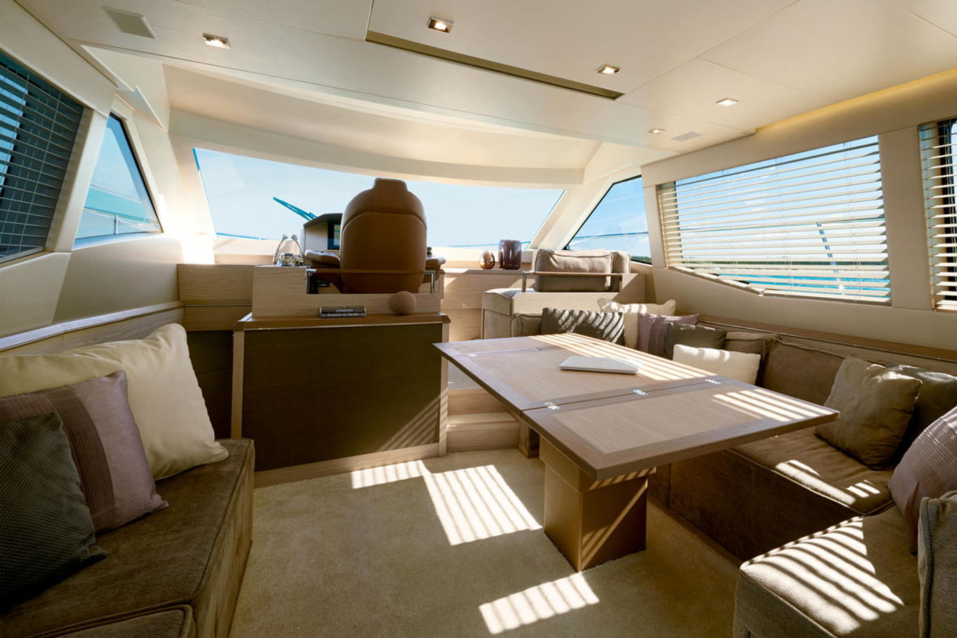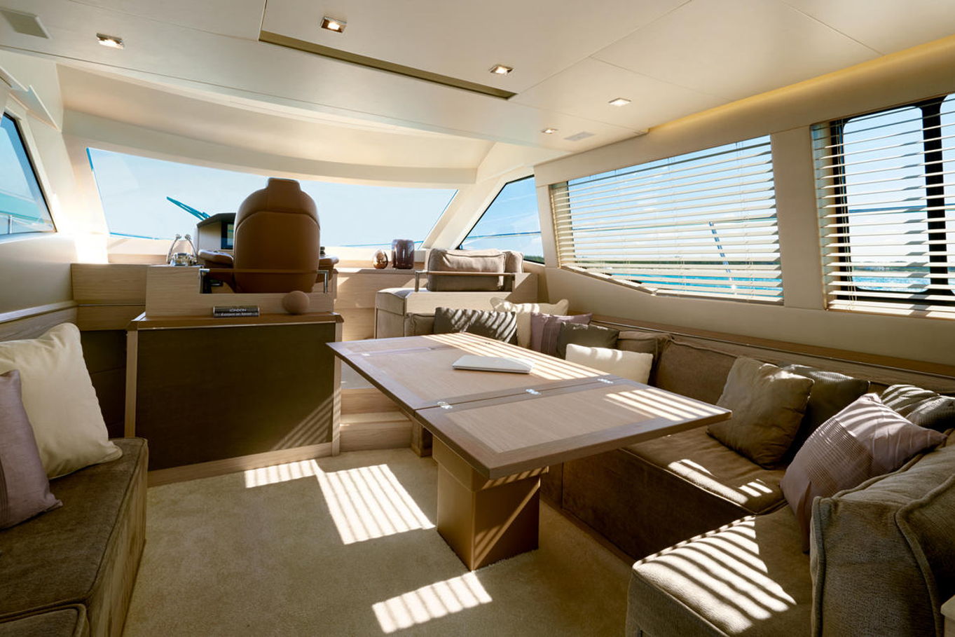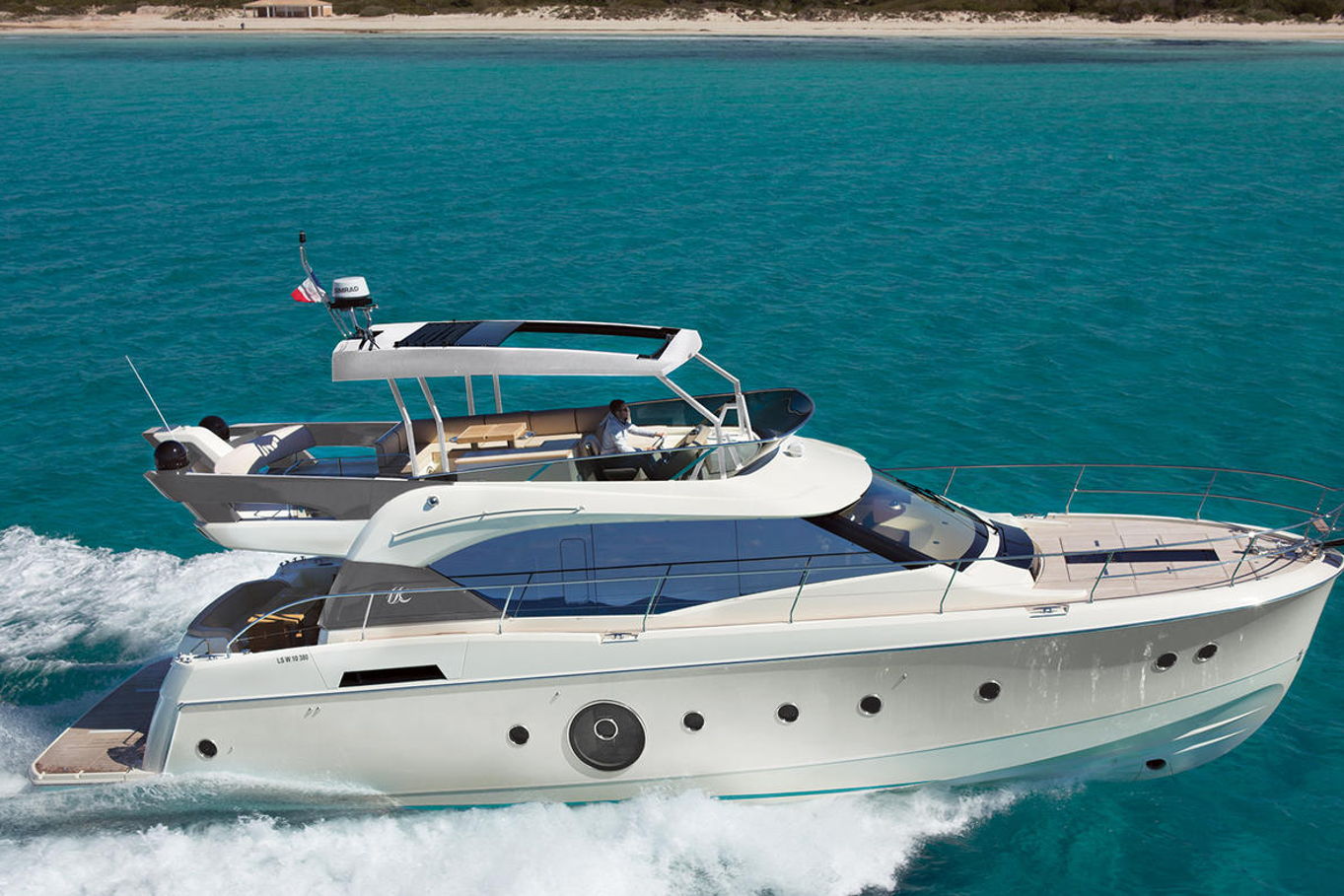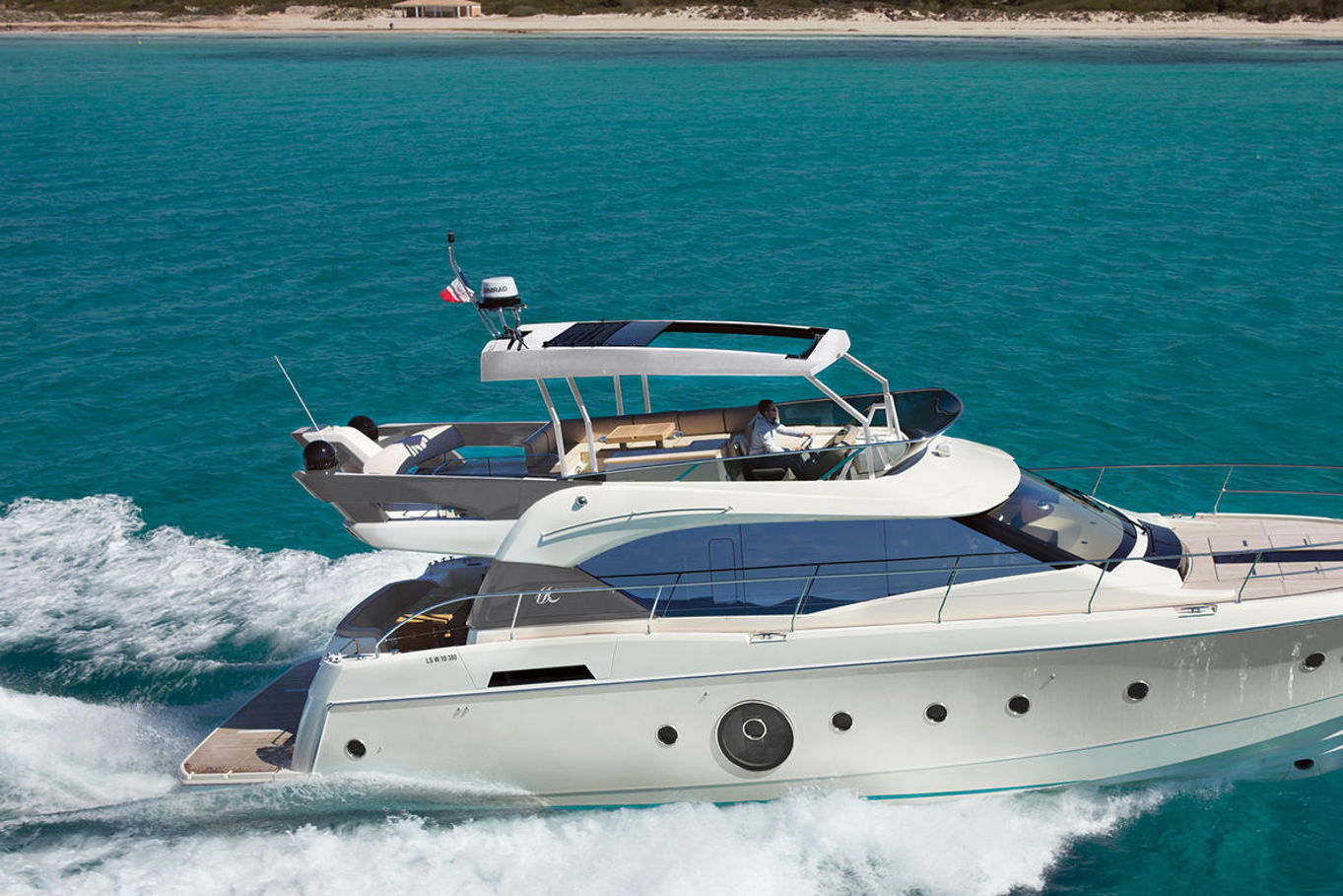 Top quality materials and detailed finishes offer a unique lifestyle for a motor cruiser this size. The interior boasts a spacious and open design, seamlessly connecting the galley at the centre of the boat with the huge lounge and central steering station.
