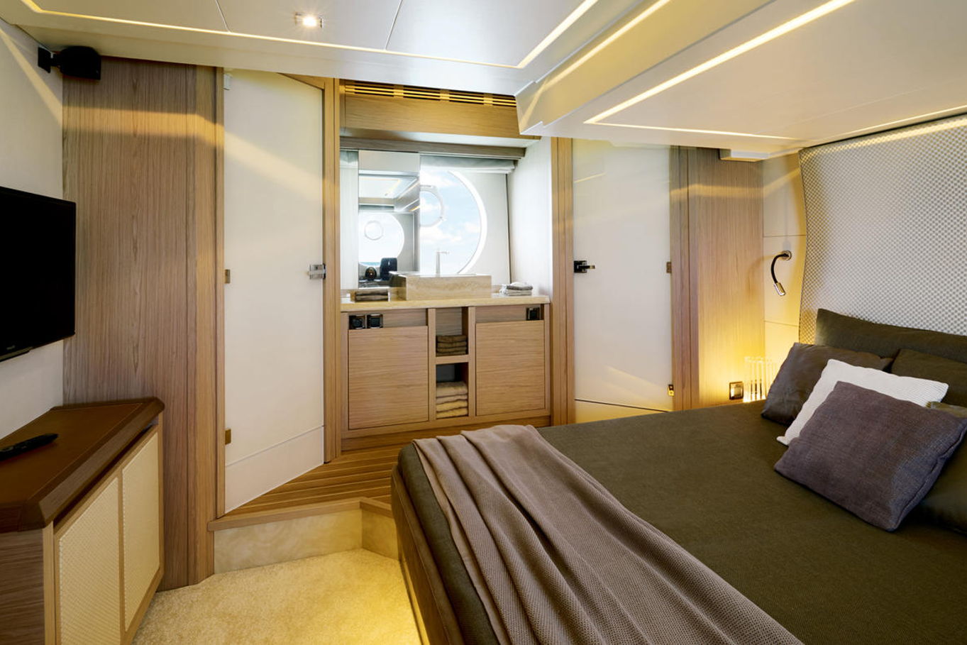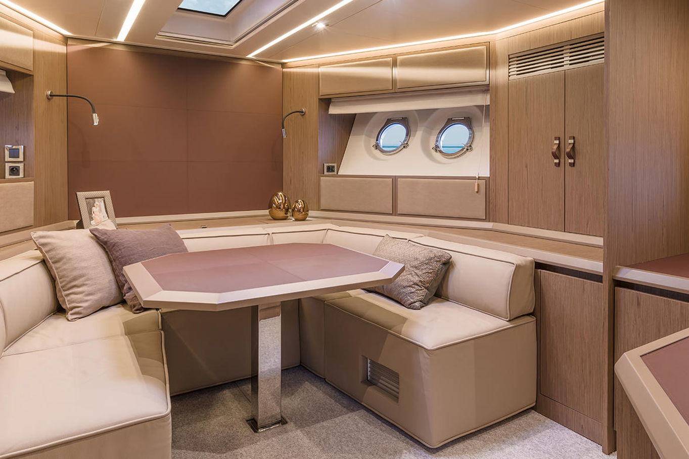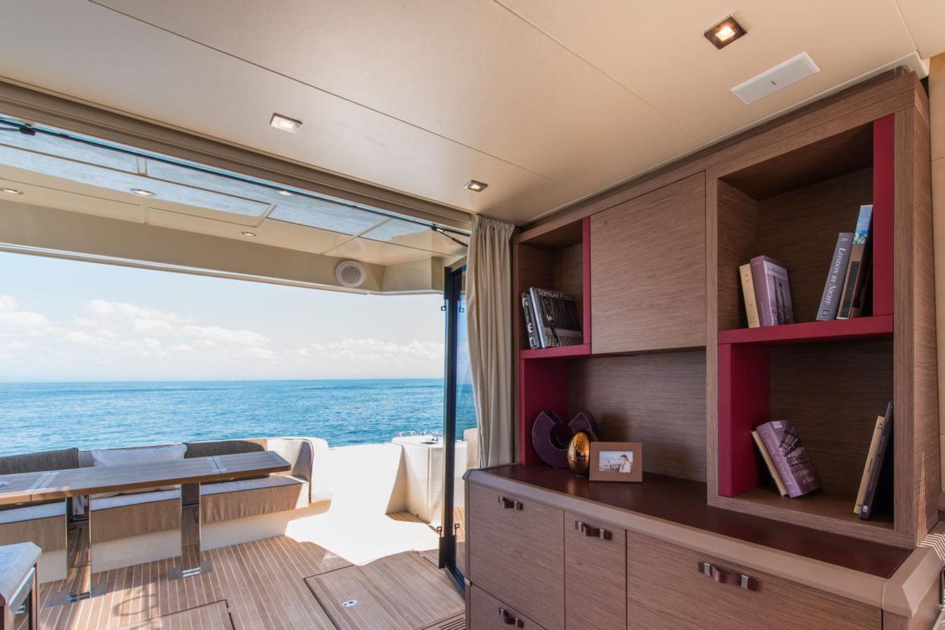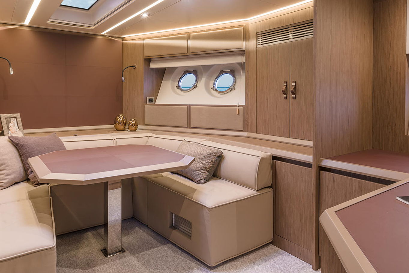 Top quality materials and detailed finishes offer a unique lifestyle for a motor cruiser this size. The interior boasts a spacious and open design, seamlessly connecting the galley at the centre of the boat with the huge lounge and central steering station.