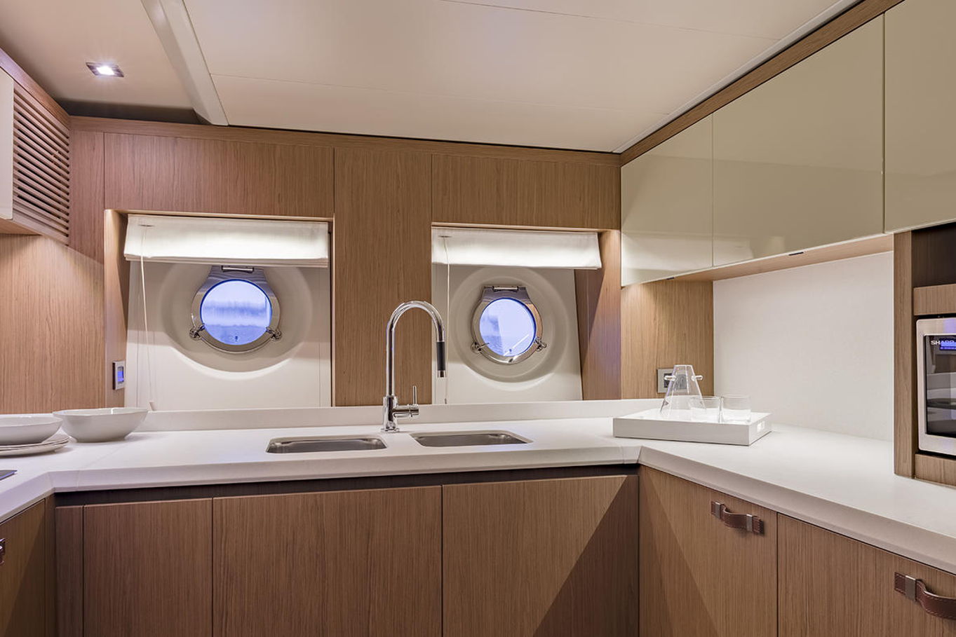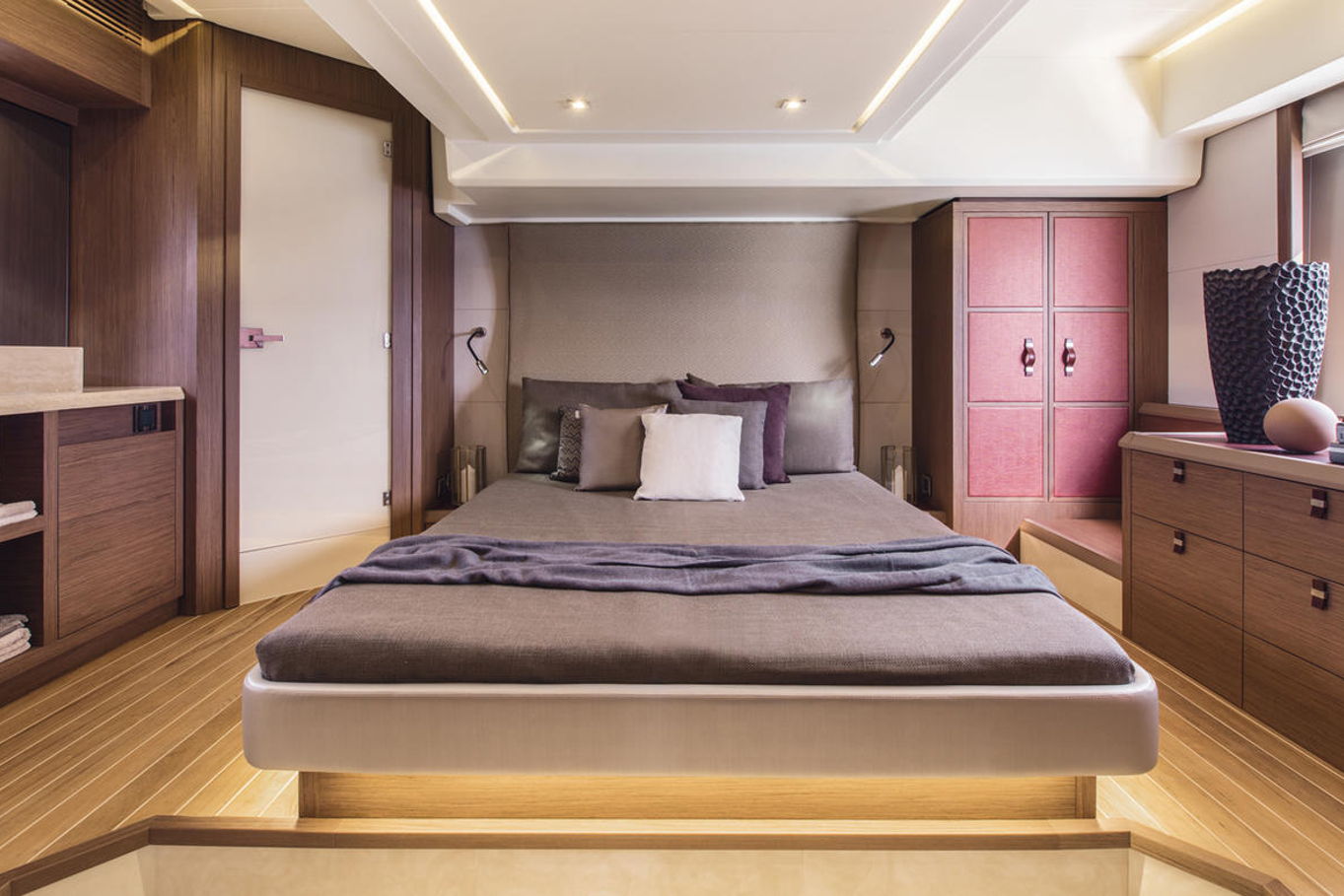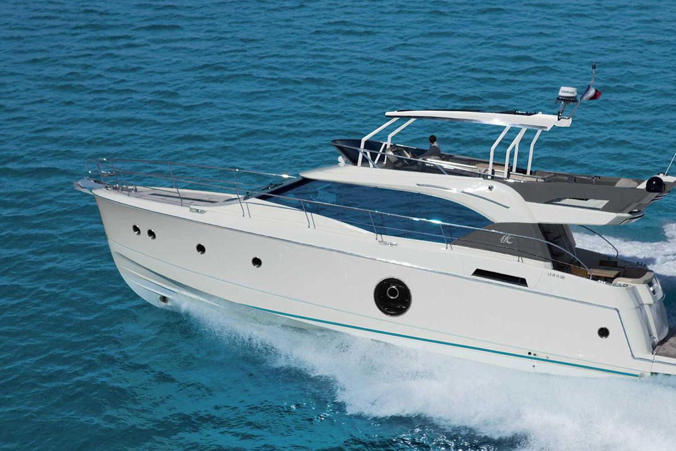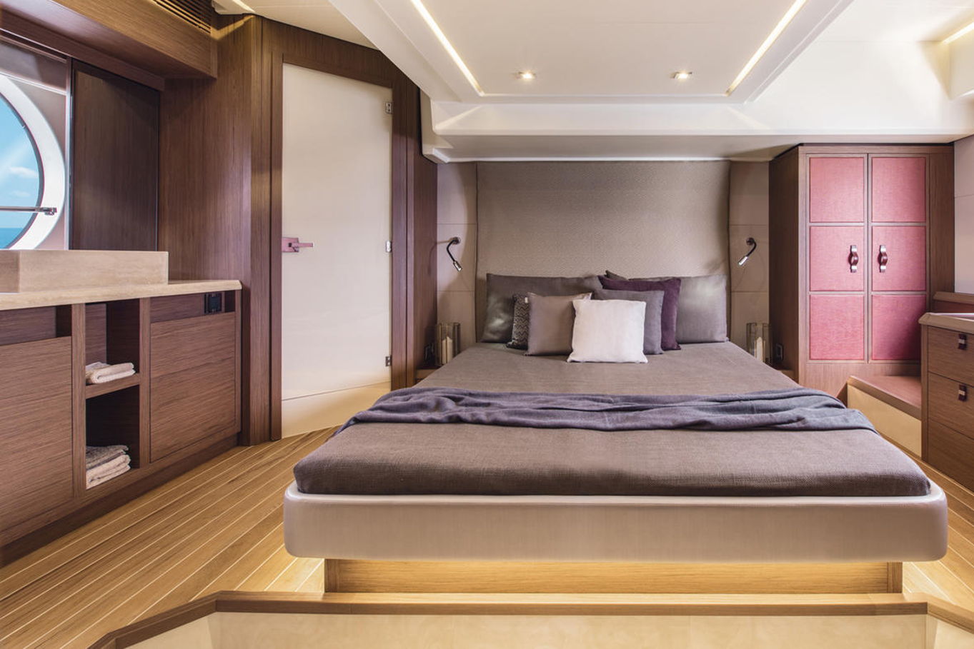 Top quality materials and detailed finishes offer a unique lifestyle for a motor cruiser this size. The interior boasts a spacious and open design, seamlessly connecting the galley at the centre of the boat with the huge lounge and central steering station.