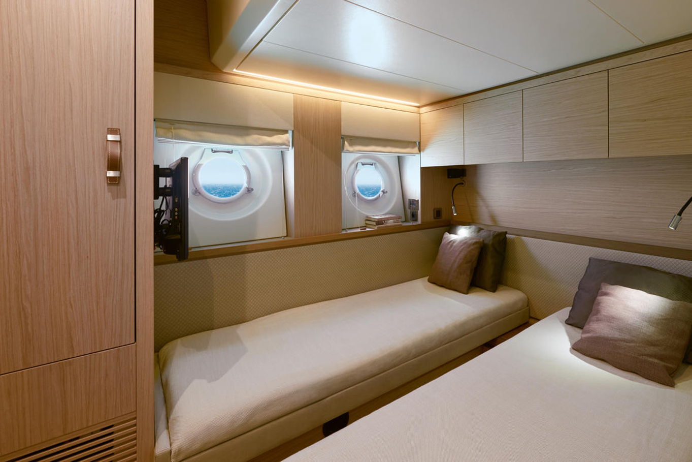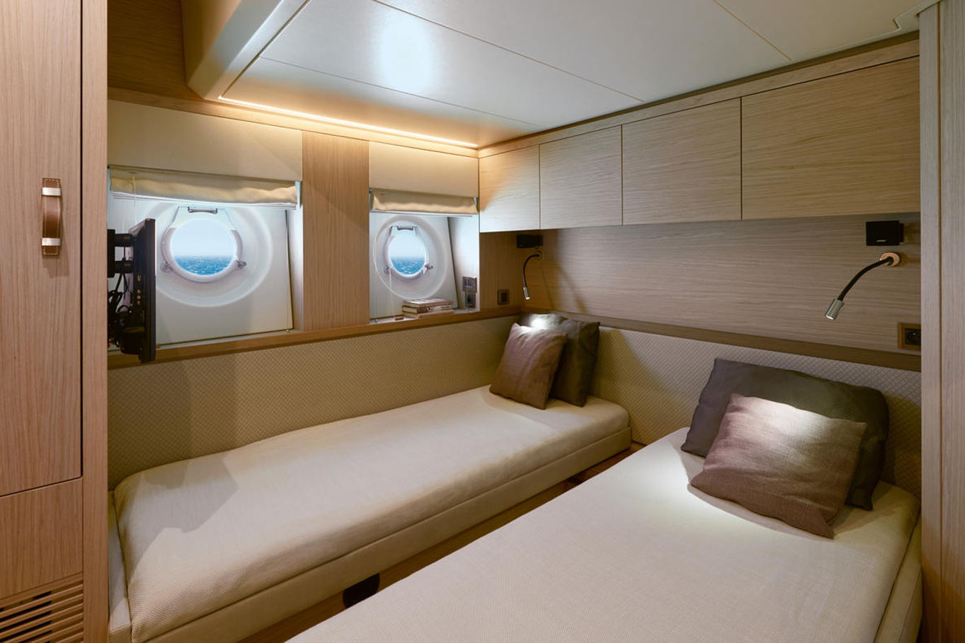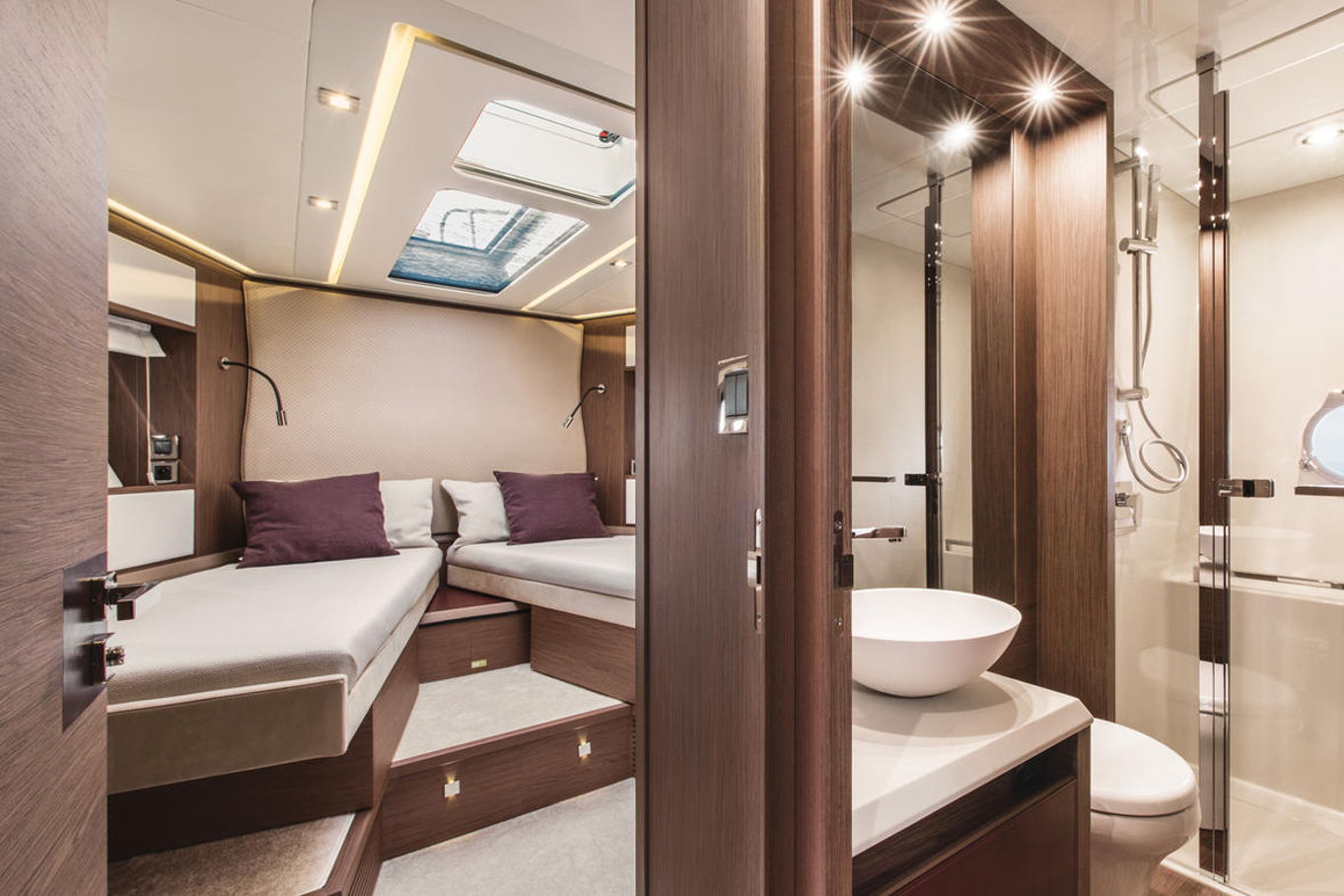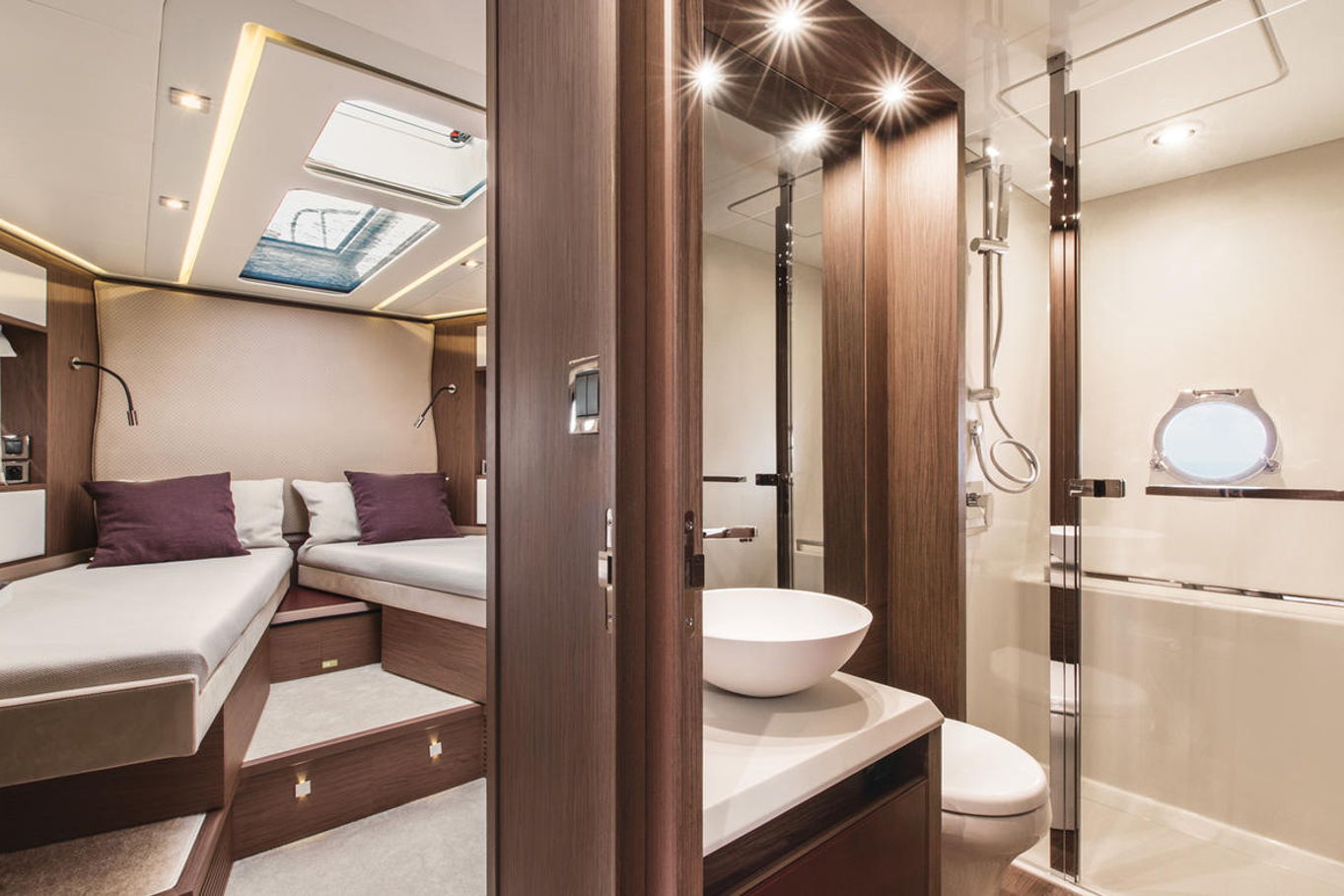 In the lower deck you will find three luxury cabins. Spacious owner's cabin with a double bed, VIP cabin with a double bed and in the third cabin there are two single beds. Of course there is a lot of storage and hanging space, air conditioning and a private bathroom.