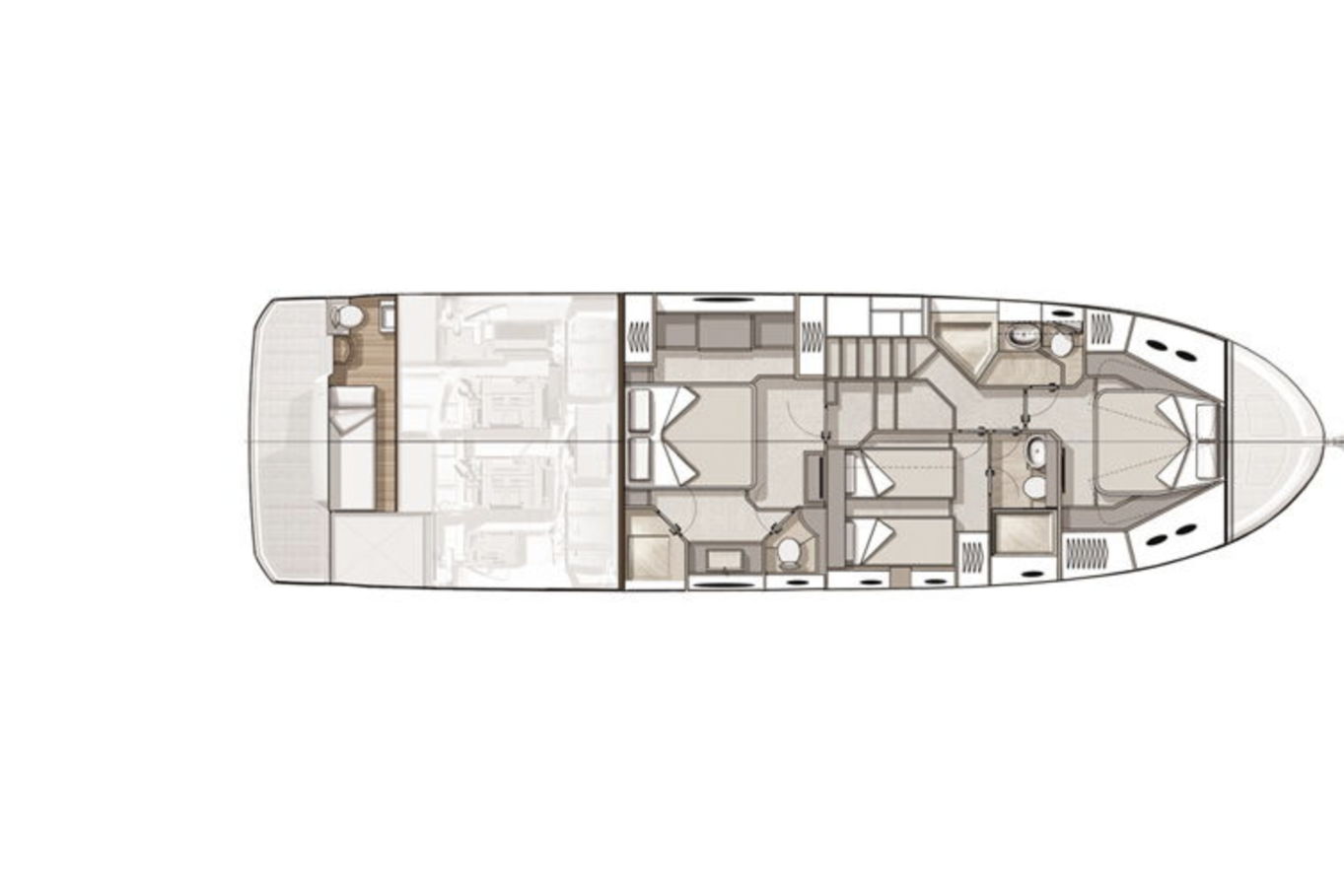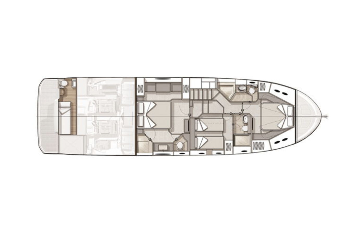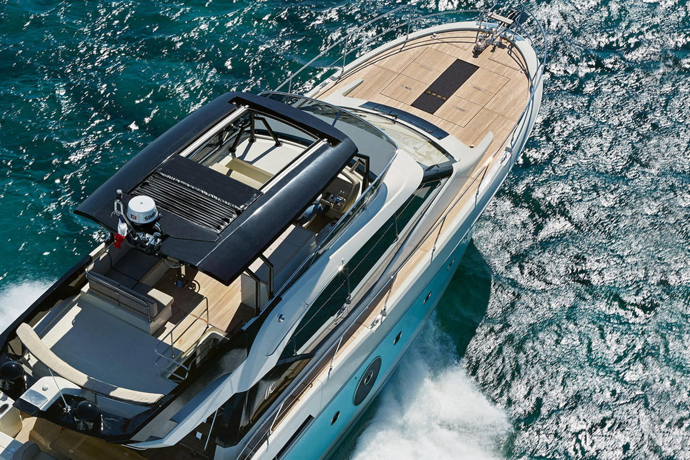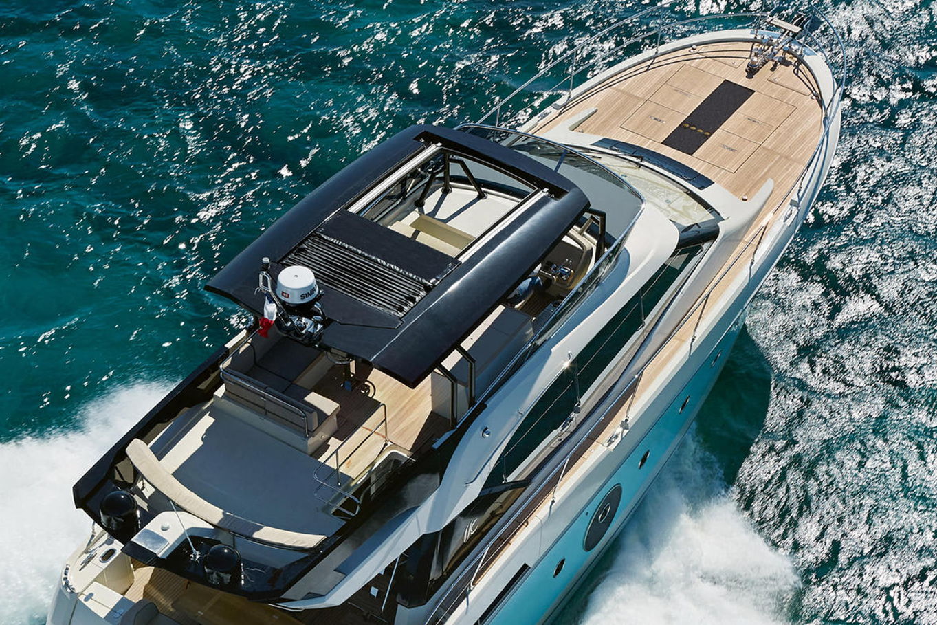 Flybridge is designed to be the primary living space on board. Remarkably equipped, its layout is reminiscent of a huge terrace with a kitchen integrated. You can enjoy the large sun-loungers or sit in the shade of its T-top.