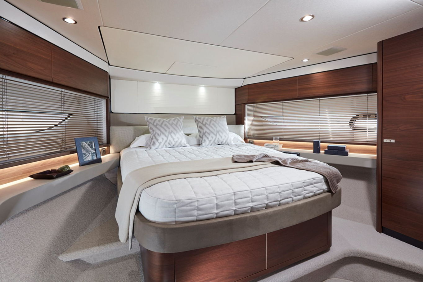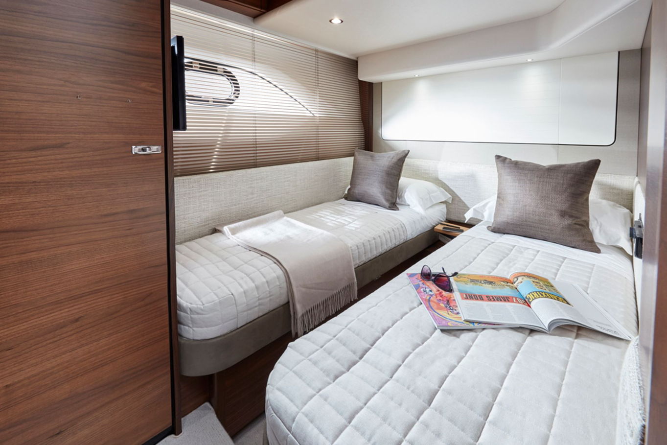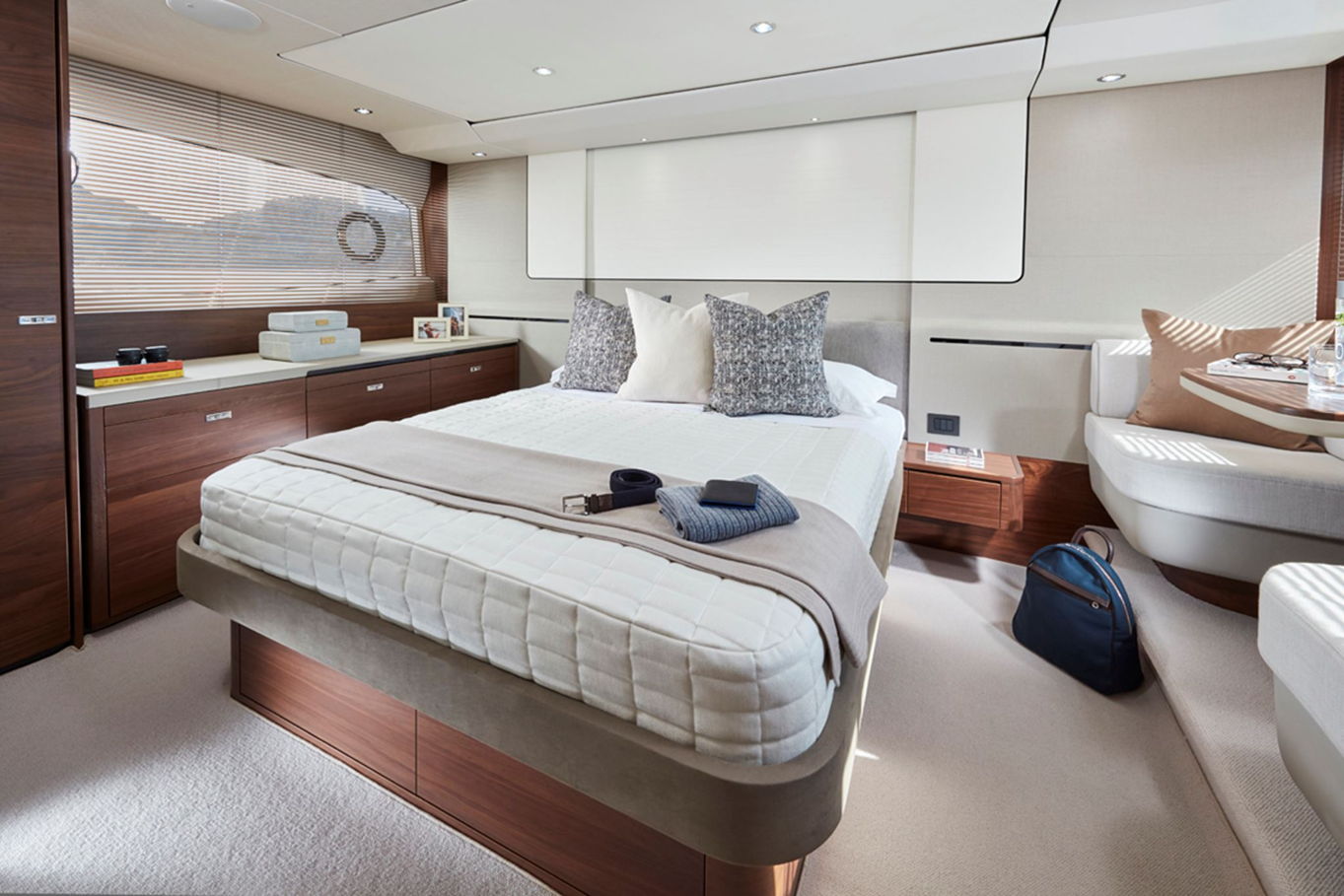 Princess 62 accommodates up to eight guests in truly spacious luxerious cabins. In the largest cabin, the master cabin, there is a double bed and a seating area. There is also a VIP cabin furnished with a double bed. In the third cabin you will find two single beds available of which you can turn into a double bed. In the last cabin there is a bunk bed. In total there are also three bathrooms on board.