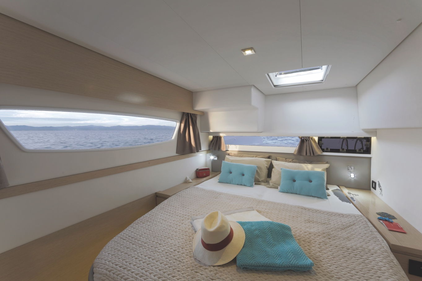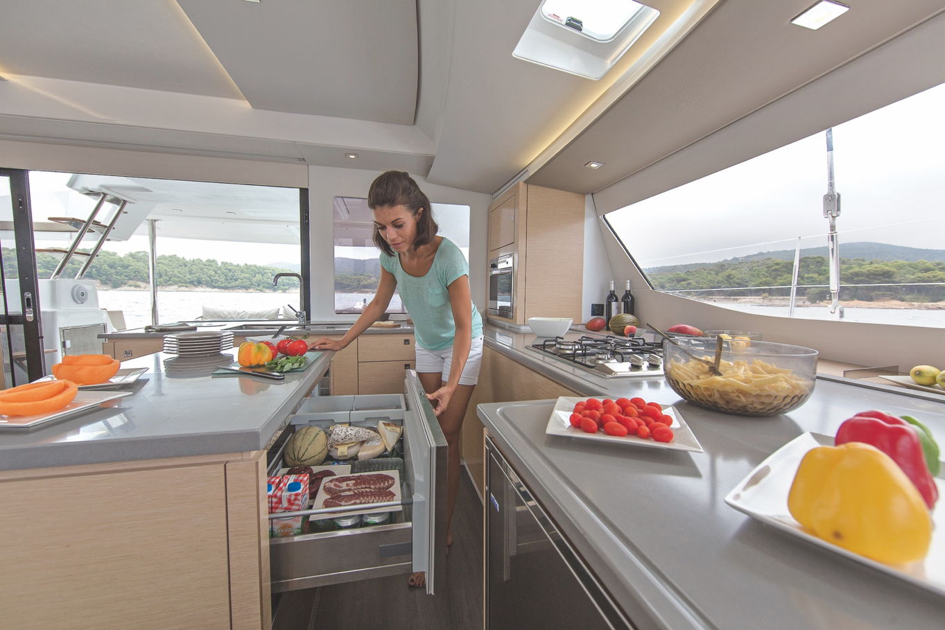 In the middle of the boat you will find a very spacious and fully equipped kitchen with everything you can think of - there is also a refrigerator, freezer, ice maker, coffee maker, dishwasher and microwave. You are guaranteed to feel like home in this kitchen. Thanks to the sliding door, it can also be easily connected with an outdoor seating area.