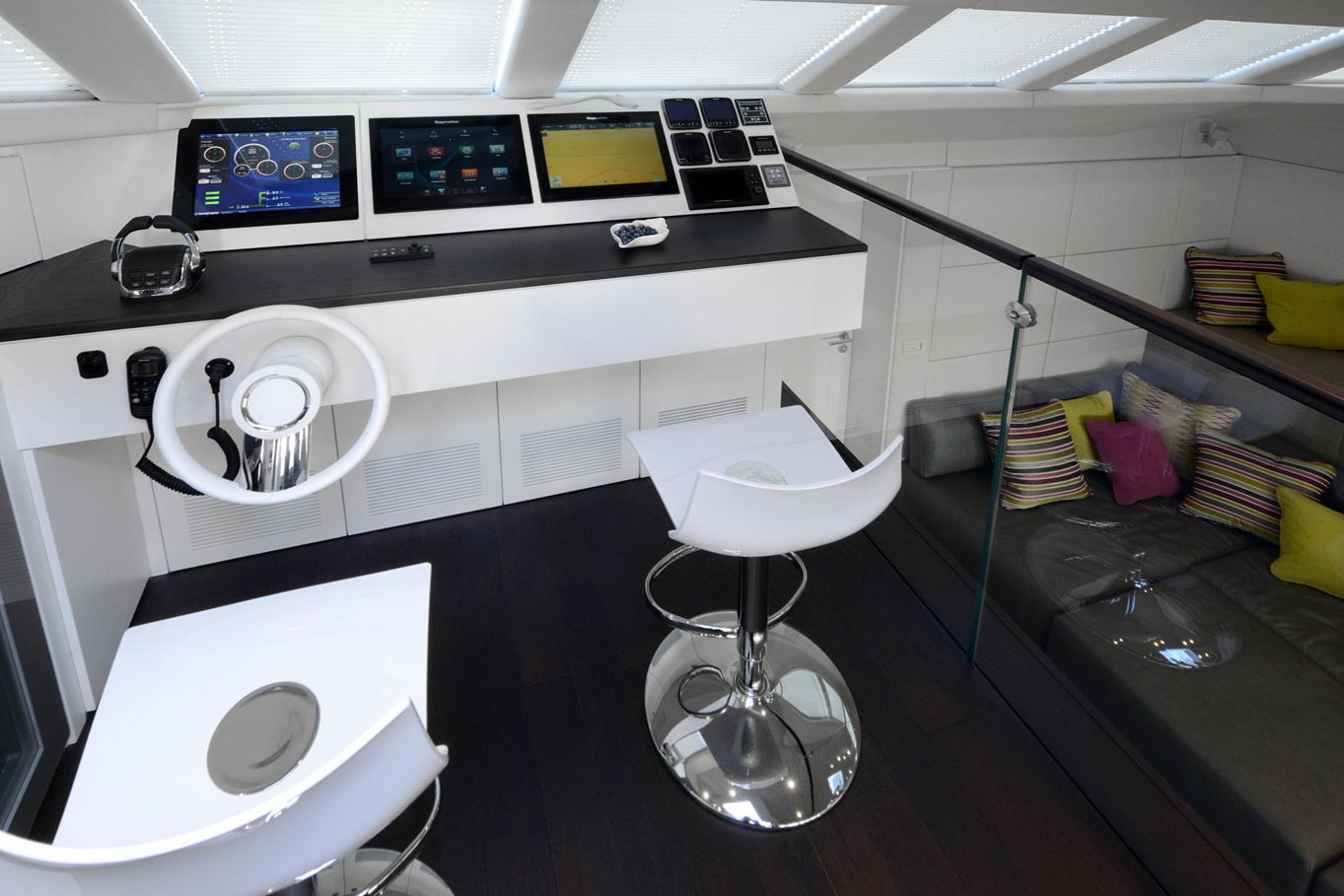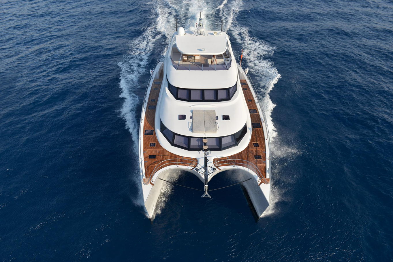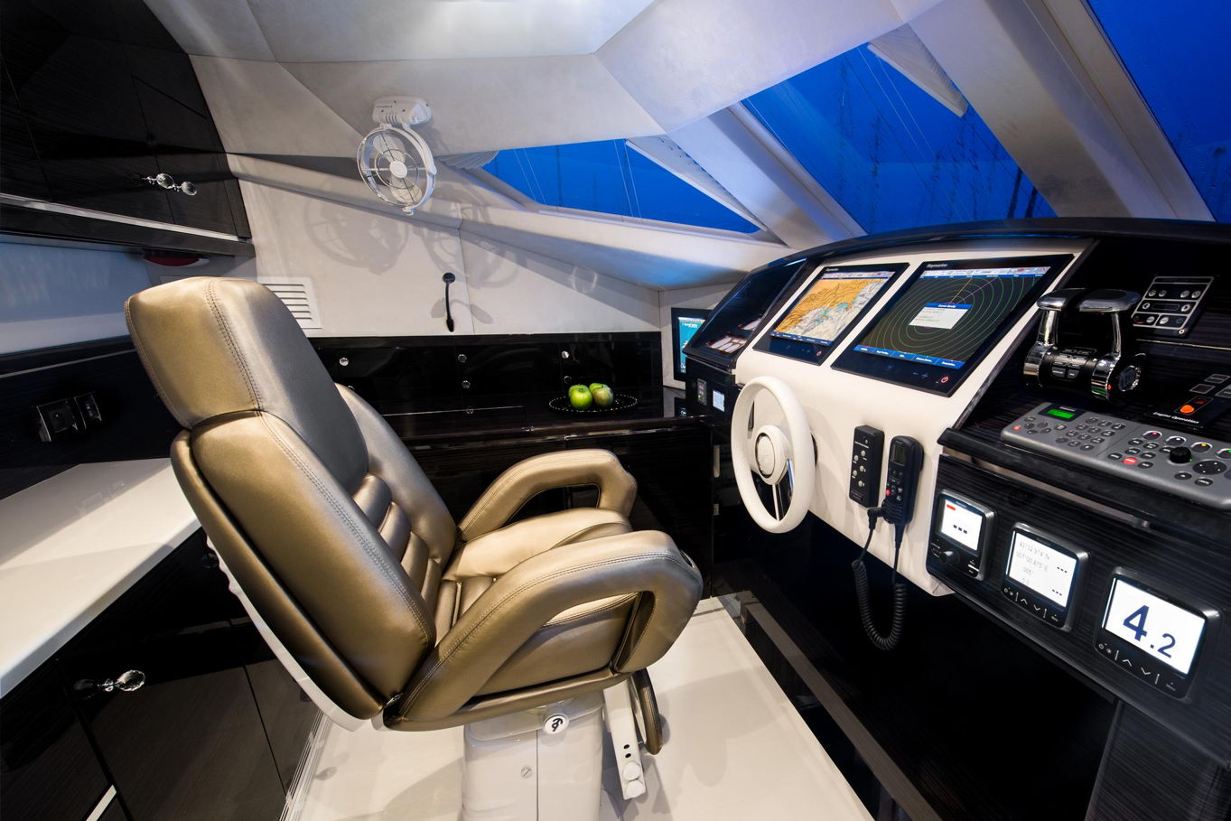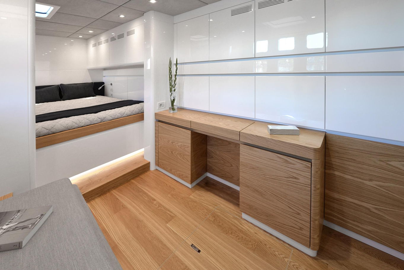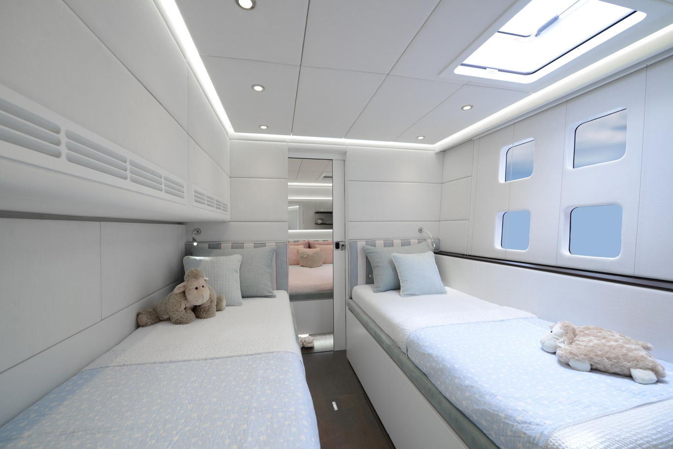 On the bow of the yacht is a large captain's cabin with a double bed, spacious storage areas and a seating area. In the deck-house there are also three additional double cabins with private bathrooms, so the boat can accommodate a total of 8 people. All cabins are of course luxuriously decorated and offer plenty of storage space.