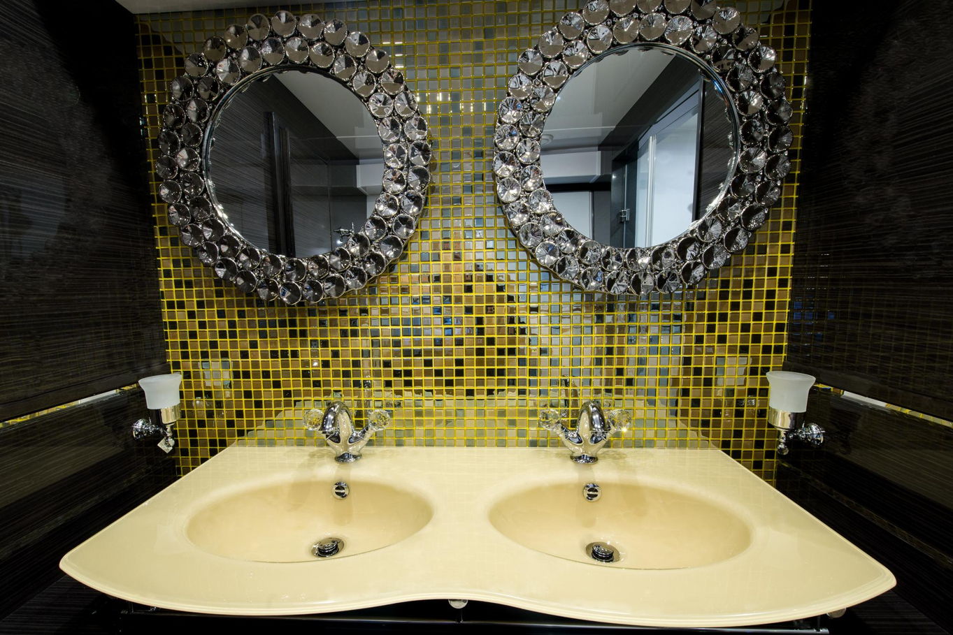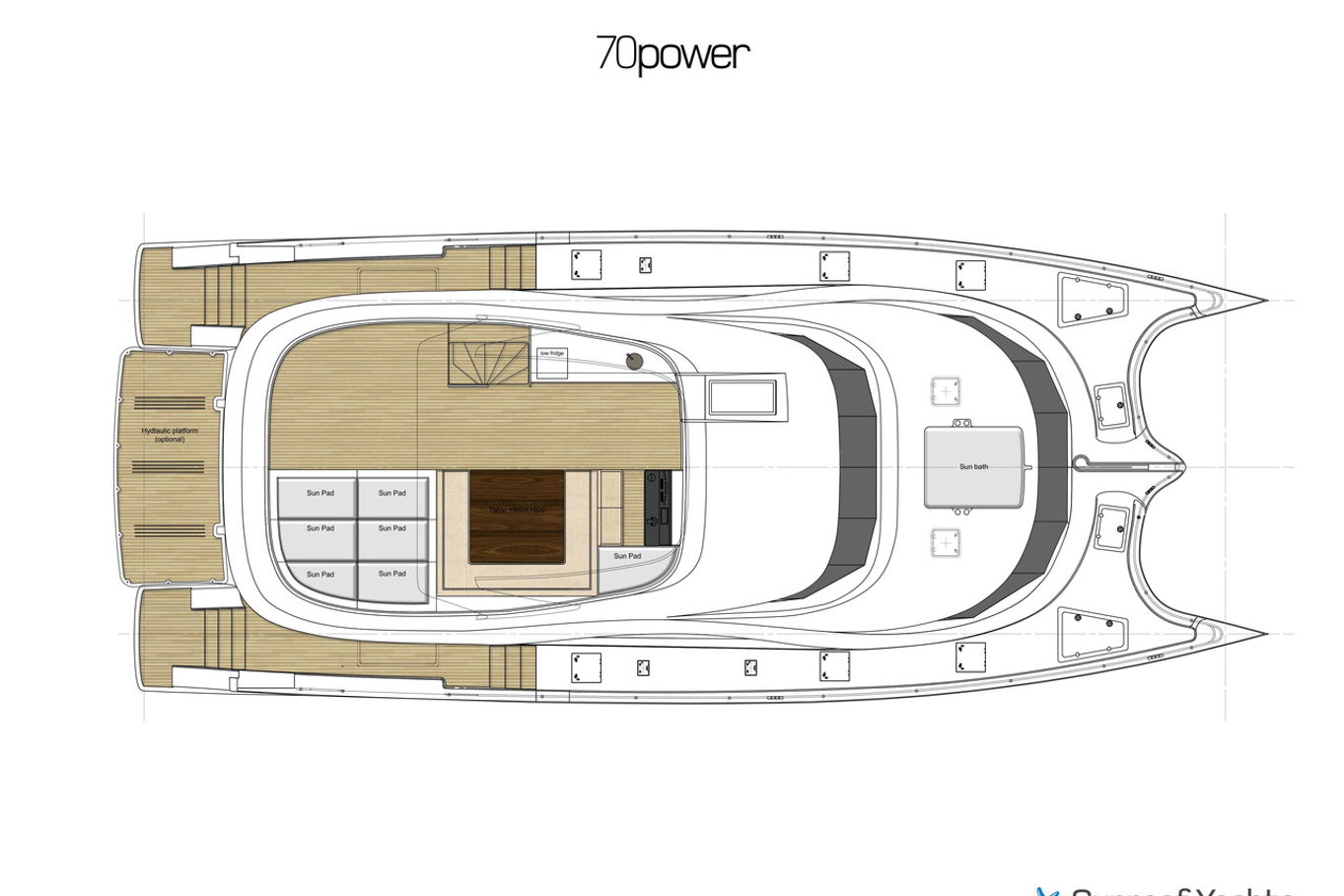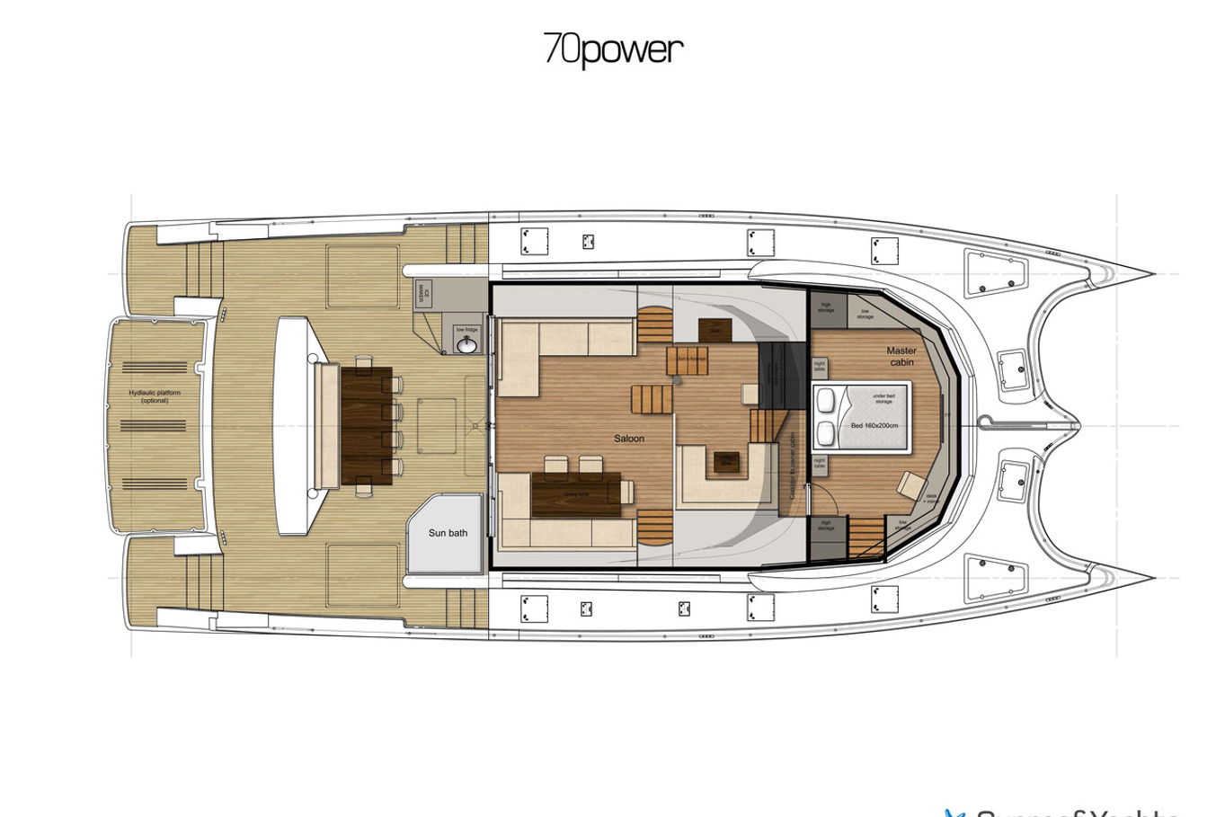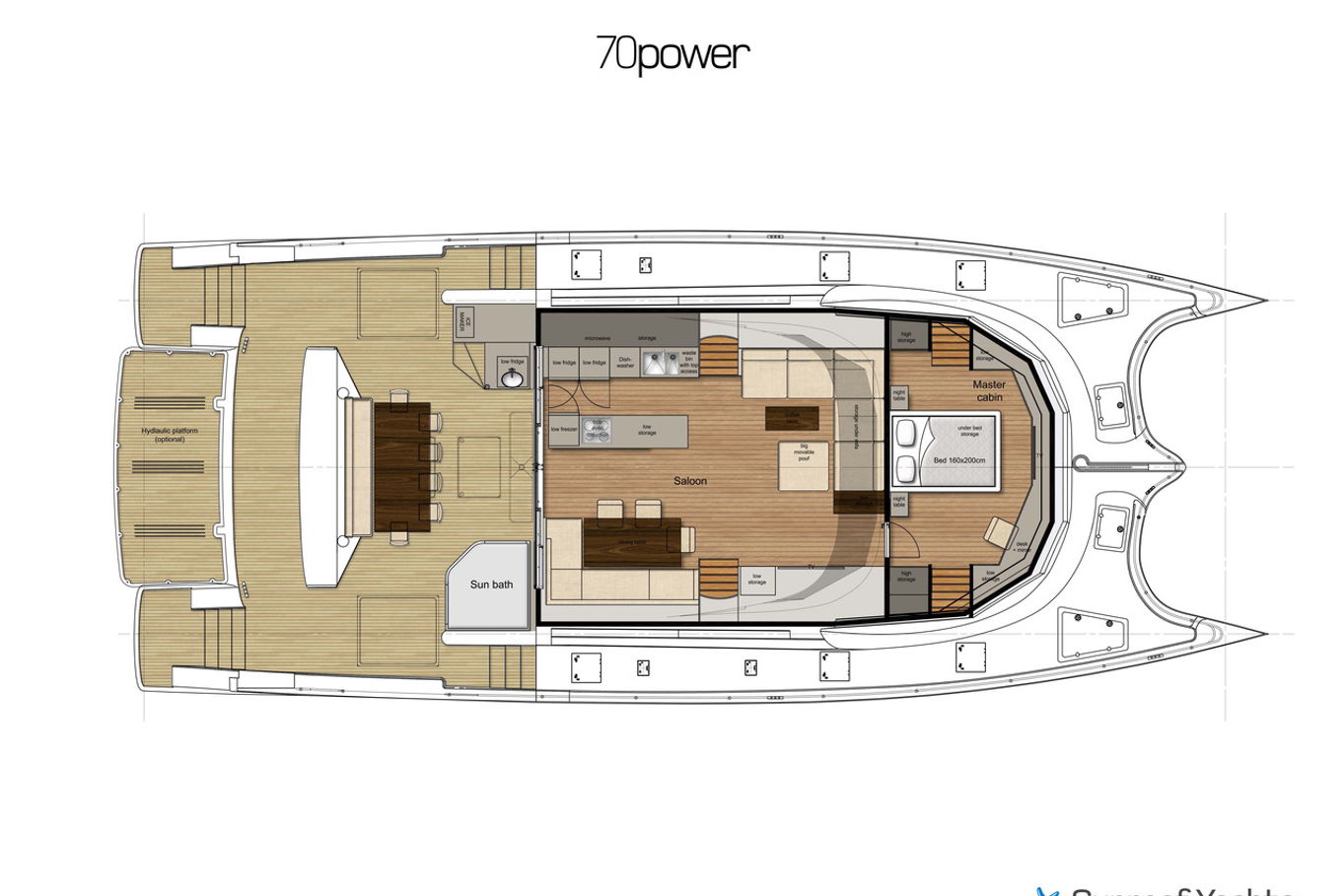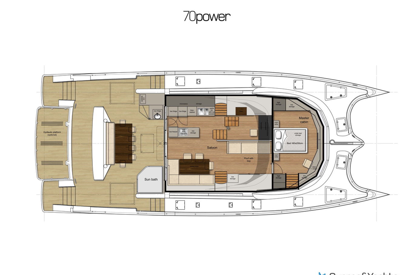 The spacious and exceptionally equipped salon has a dining area, a fully equipped kitchen and a bar. The salon smoothly and continuously connects you to the back of the boat with comfortable and modern seating. The most popular part of the boat is undoubtedly the upper deck, not only is there a fantastic view, but also the top of the range facilities are used to totally relax after a day in the sunshine or after exploring the seaside towns. There is a comfortable seating area, a jacuzzi for four to five people with heated seats and a shower, karaoke with high-quality audio equipment, disco lights and a 50-inch waterproof TV. Below the lifting staircase is a special garage tucked away for diving equipment and water sports.