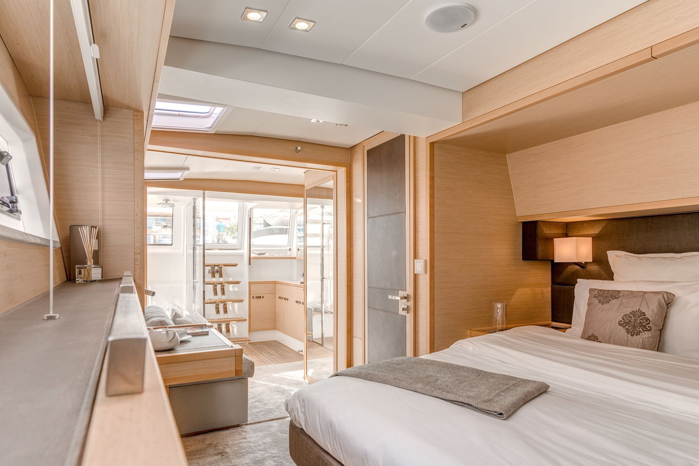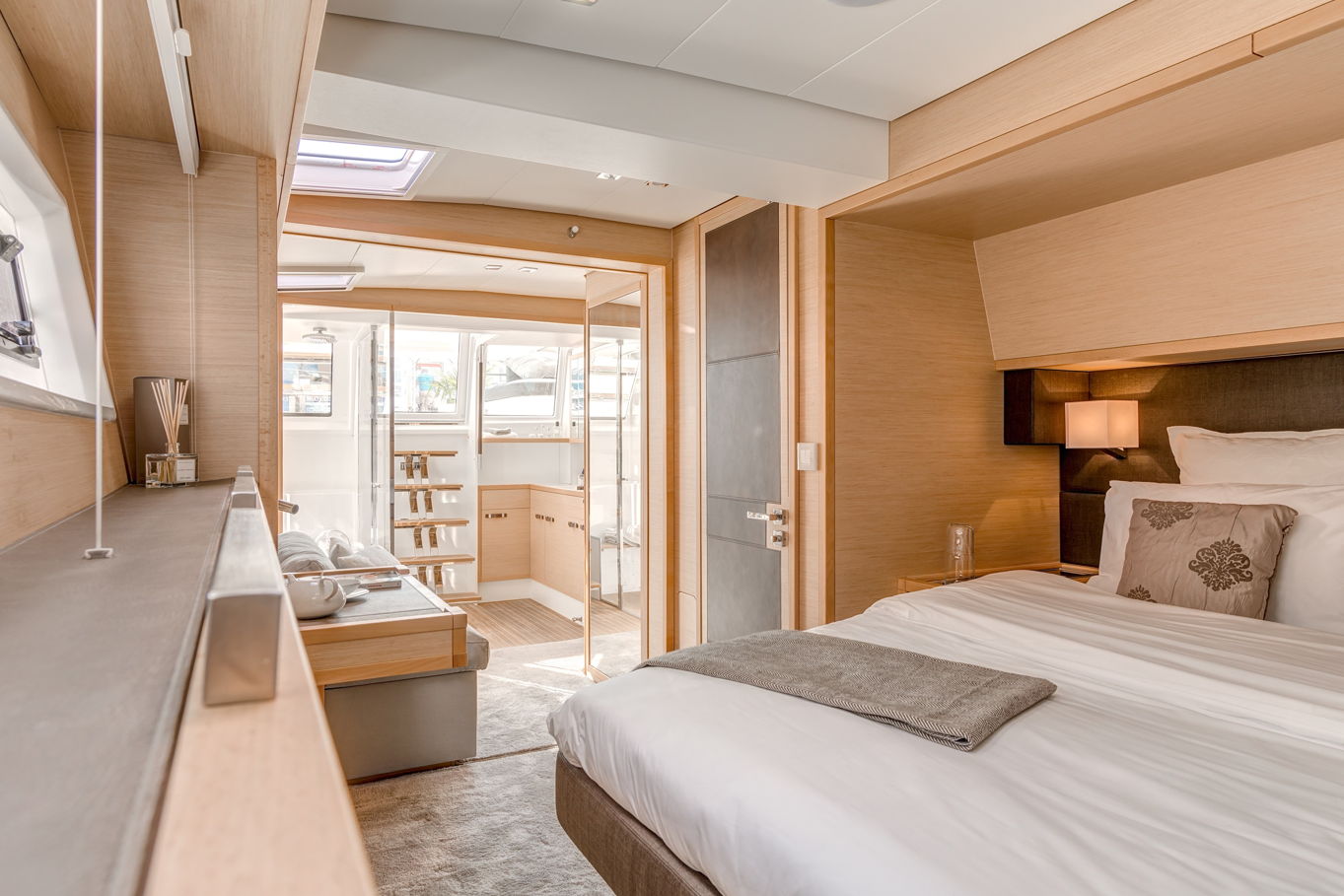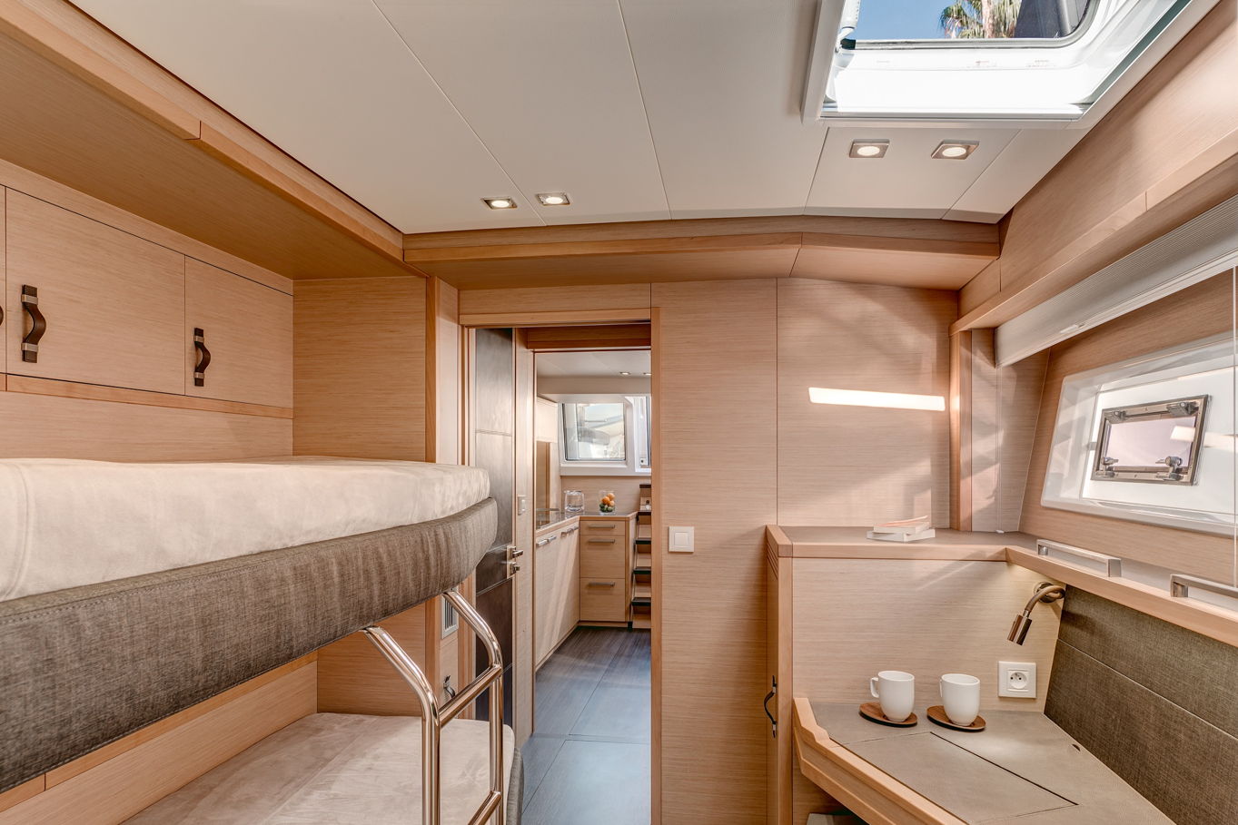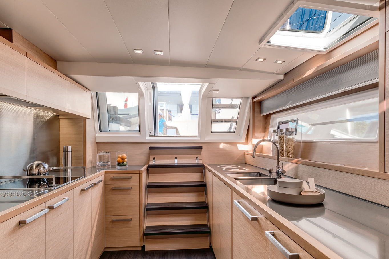 Lagoon 630 pohodlně ubytuje až 10 osob v pěti kajutách. V největší z nich, majitelské, je velká manželská postel, šatna, TV, posezení a vlastní koupelna. Manželské postele jsou i v dalších třech kajutách, v poslední, páté kabině jsou k dispozici dvě patrové postele. Každá kajuta má samozřejmě vlastní koupelnu s WC a úložné prostory.