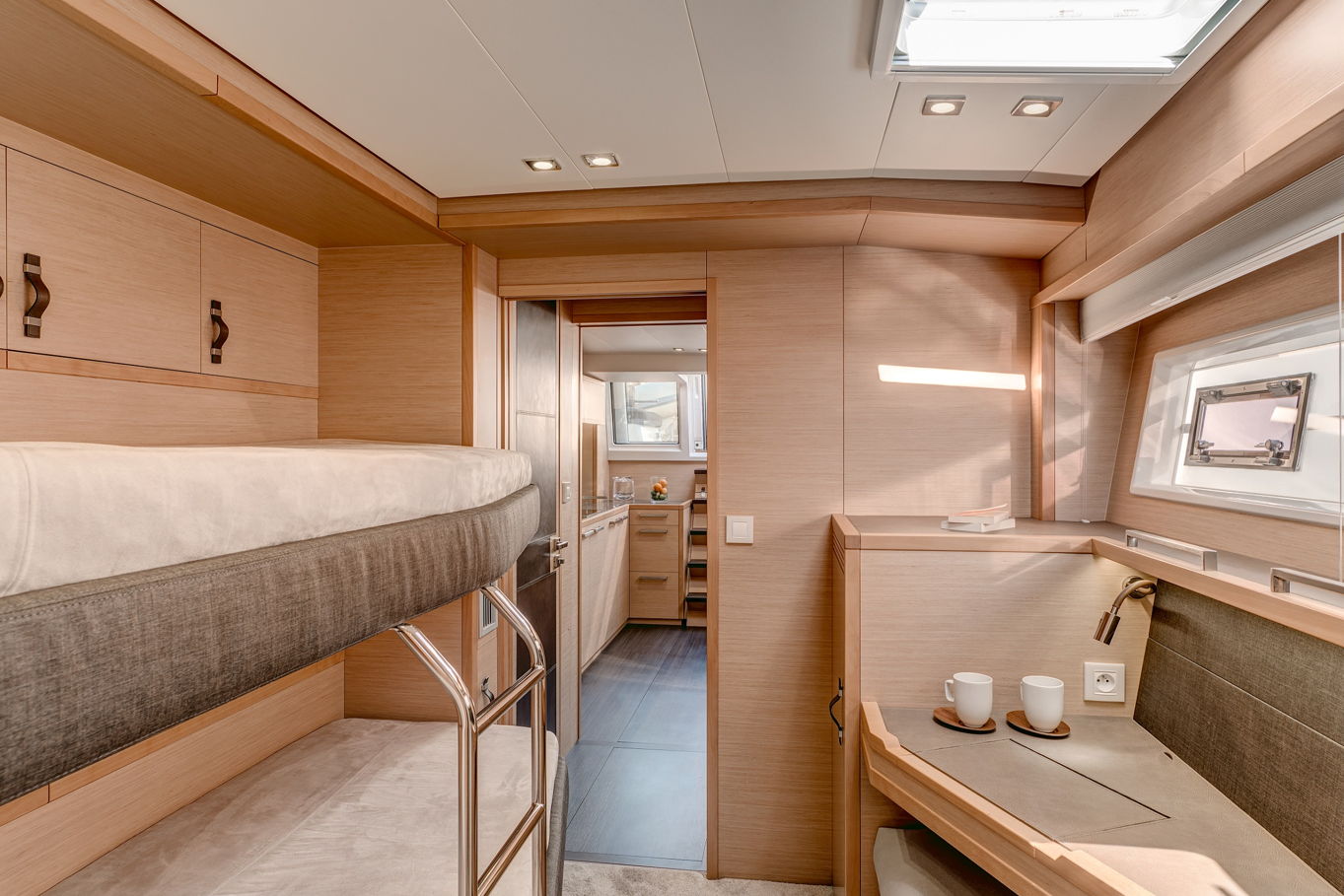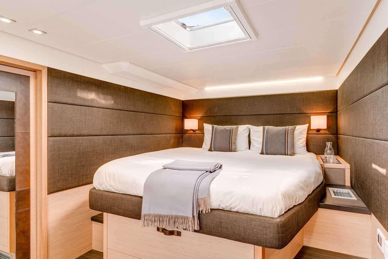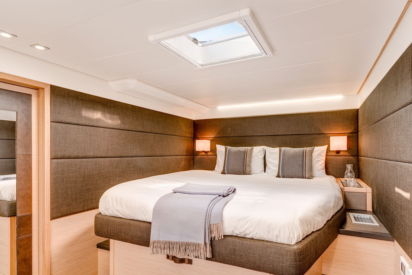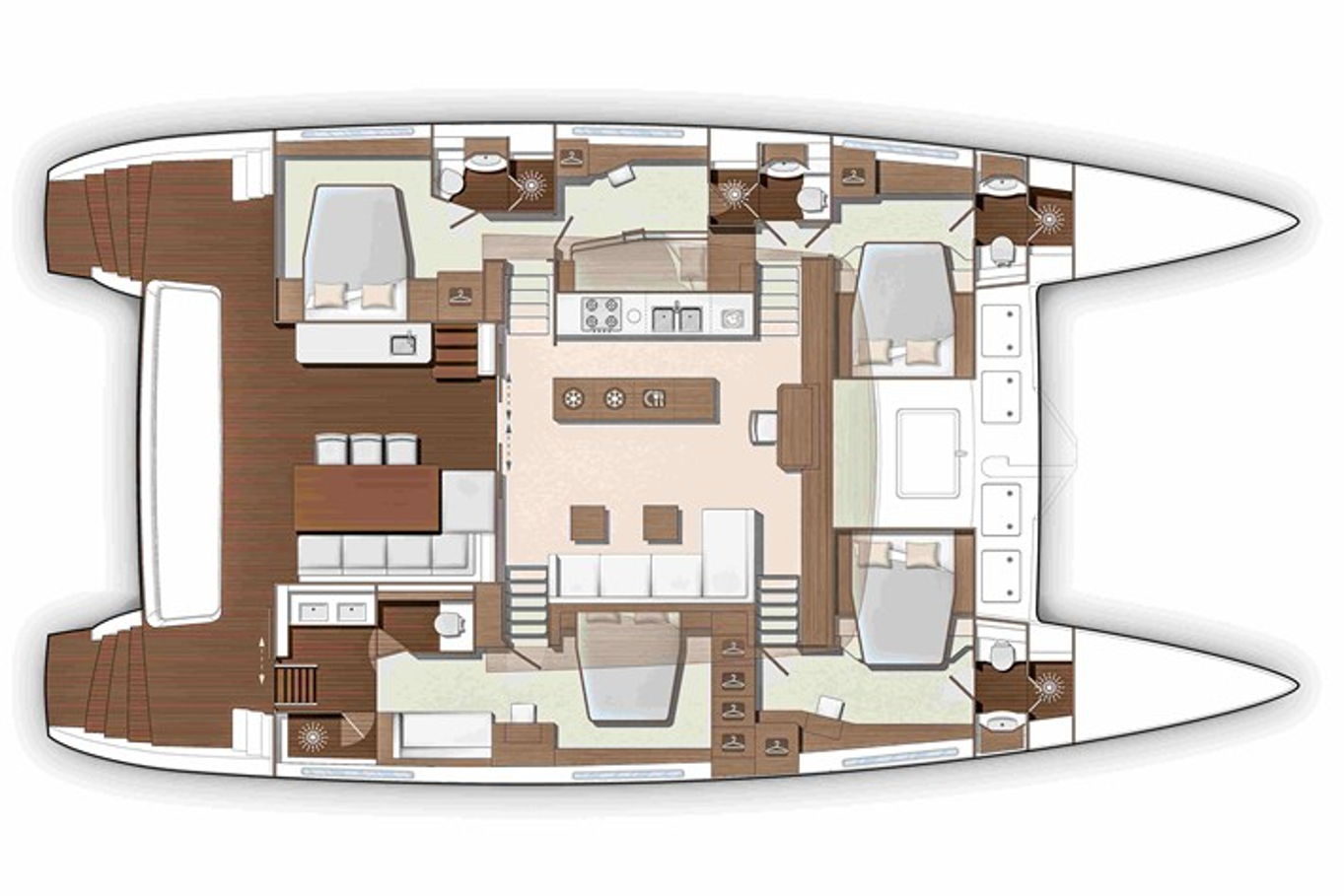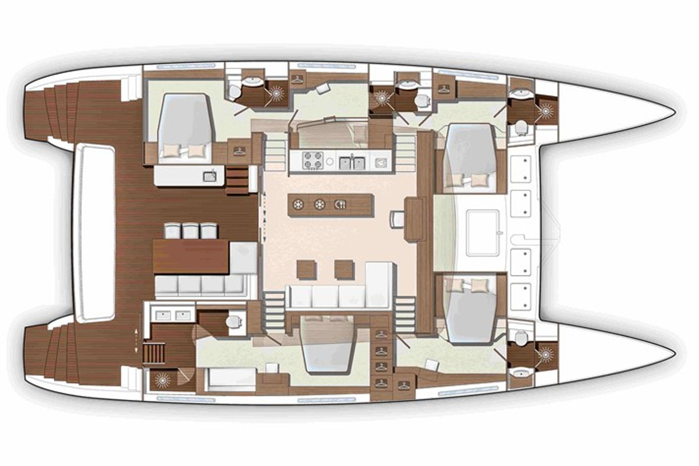 Lagoon 630 pohodlně ubytuje až 10 osob v pěti kajutách. V největší z nich, majitelské, je velká manželská postel, šatna, TV, posezení a vlastní koupelna. Manželské postele jsou i v dalších třech kajutách, v poslední, páté kabině jsou k dispozici dvě patrové postele. Každá kajuta má samozřejmě vlastní koupelnu s WC a úložné prostory.