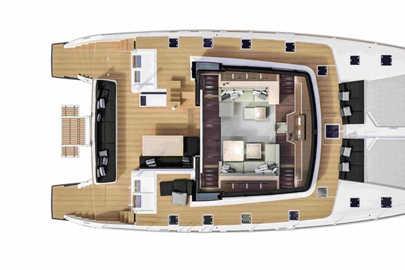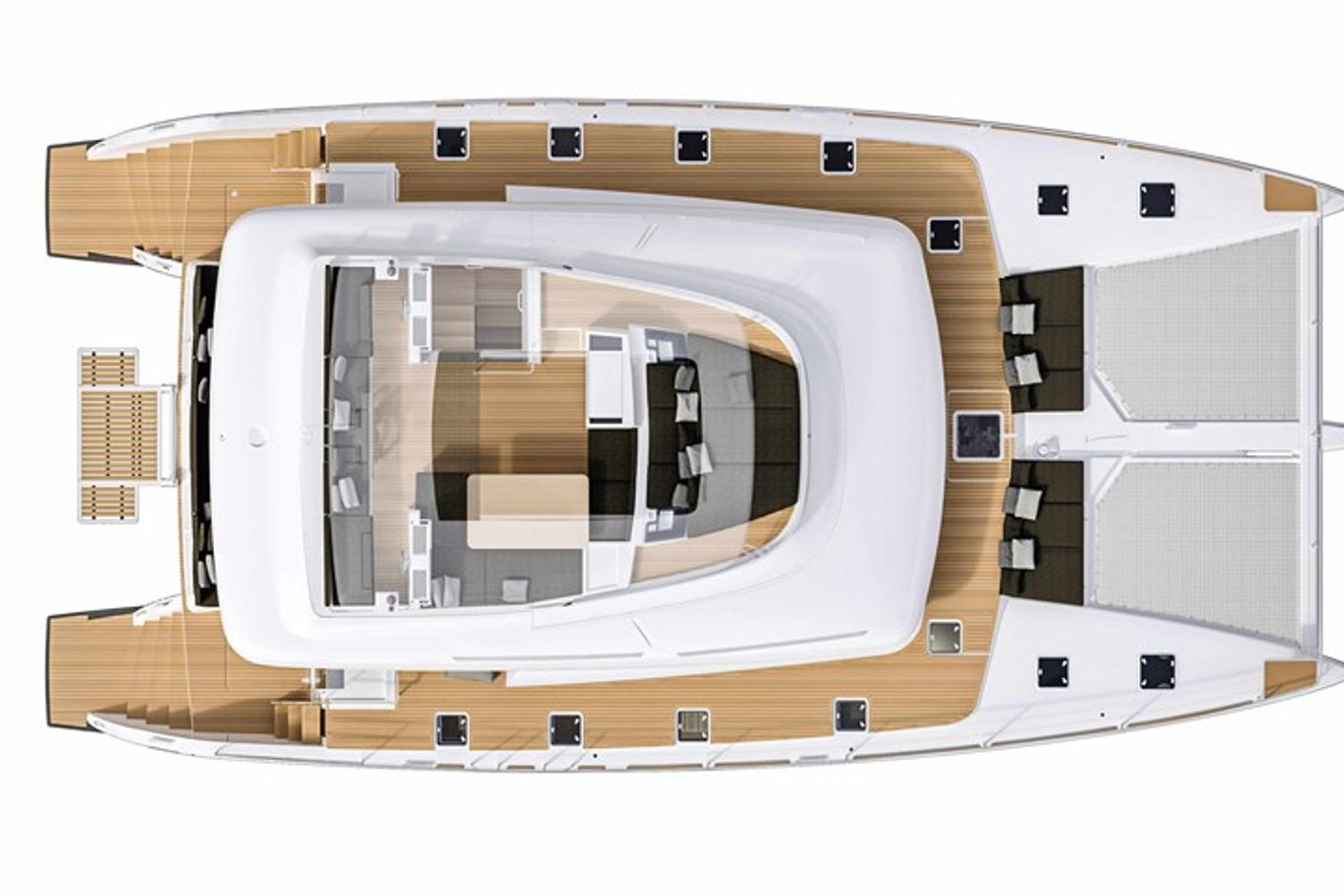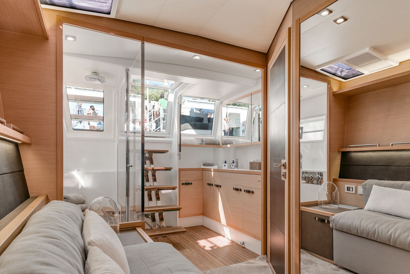 Na jachtě je hned několik relaxačních zón – opalovat se můžete na lehátkách na přídi lodi, případně vystoupat na horní palubu (flybridge), kde budete mít navíc i neskutečný výhled do okolí. Další venkovní posezení, na které se pohodlně dostanete ze salonu, je na zádi lodi. Tady budete kryti před sluncem a zároveň na čerstvém vzduchu. Možností, jak trávit na lodi volný čas, je zkrátka mnoho. A pokud se rozhodnete zakotvit v zátoce a užít si koupání a podmořský život, ze schůdků na zádi pohodlně sejdete přímo do moře.