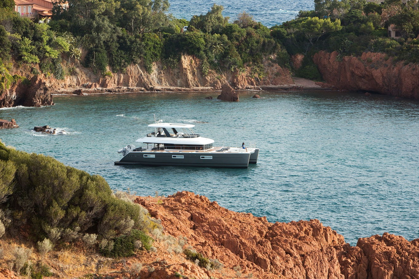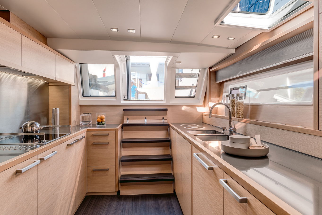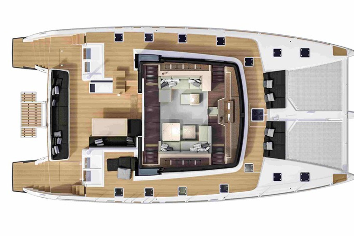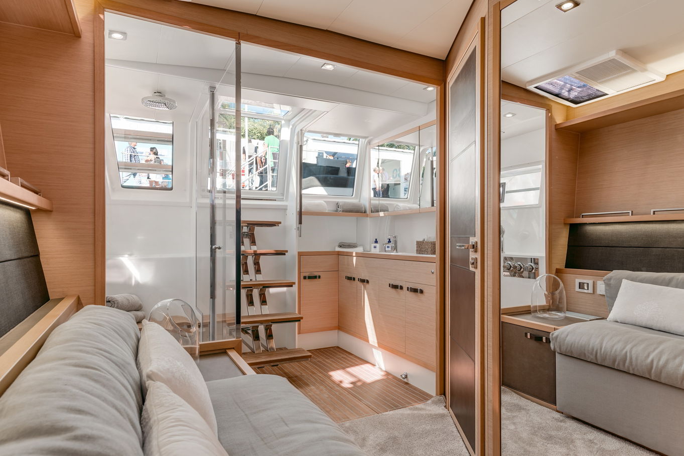 Na jachtě je hned několik relaxačních zón – opalovat se můžete na lehátkách na přídi lodi, případně vystoupat na horní palubu (flybridge), kde budete mít navíc i neskutečný výhled do okolí. Další venkovní posezení, na které se pohodlně dostanete ze salonu, je na zádi lodi. Tady budete kryti před sluncem a zároveň na čerstvém vzduchu. Možností, jak trávit na lodi volný čas, je zkrátka mnoho. A pokud se rozhodnete zakotvit v zátoce a užít si koupání a podmořský život, ze schůdků na zádi pohodlně sejdete přímo do moře.