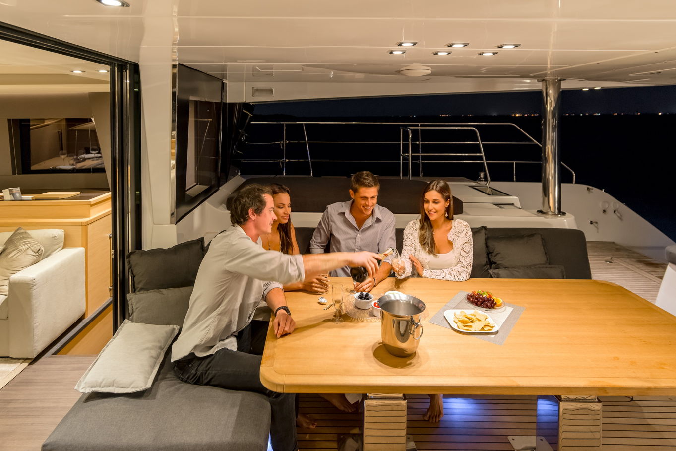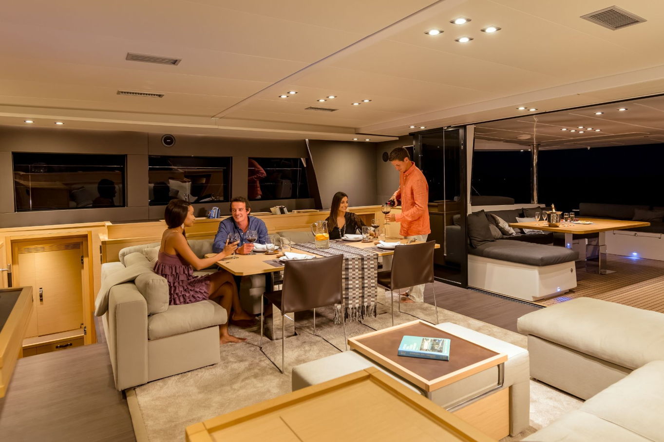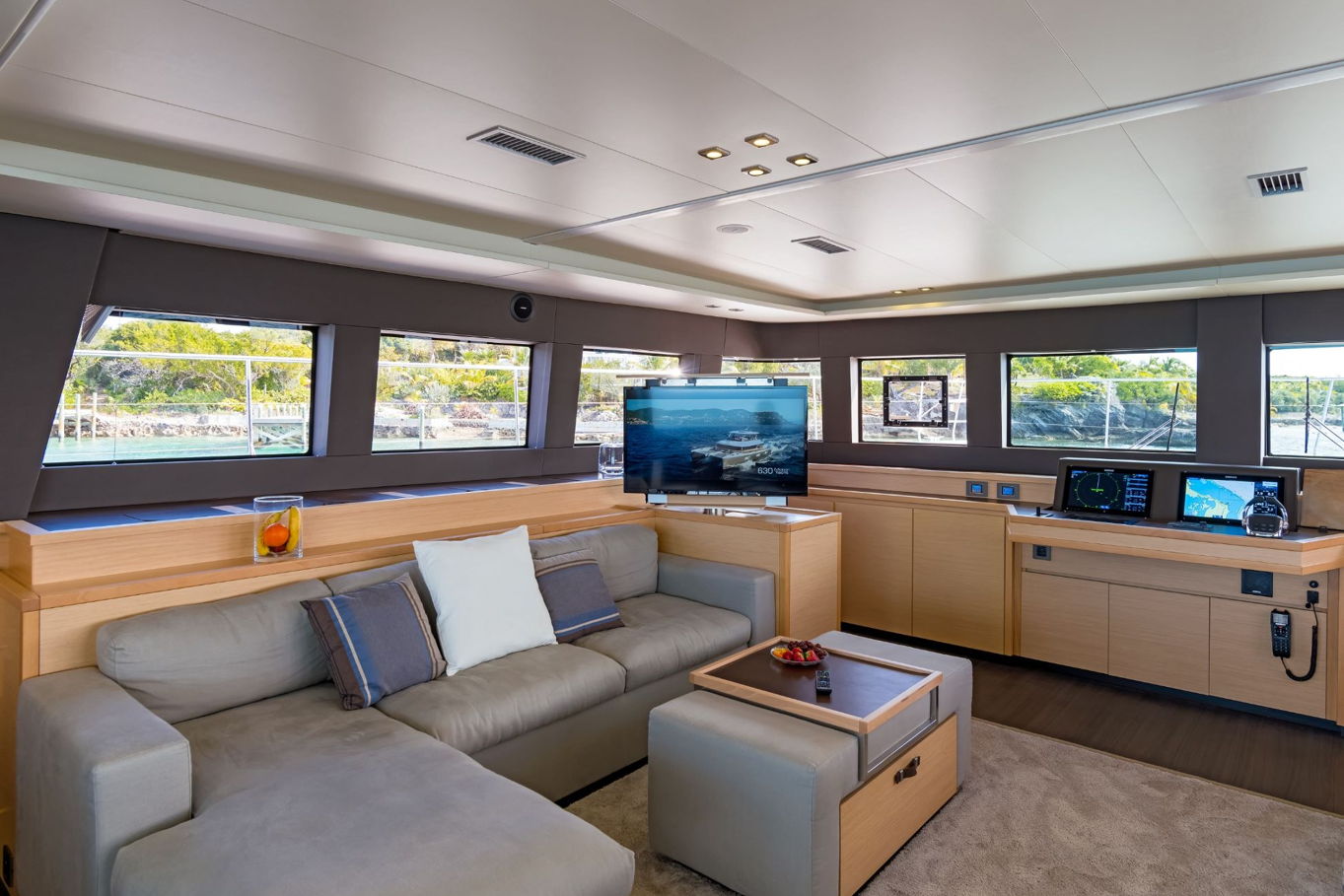 Vzhledem k prostornosti všech kajut překvapí, kolik místa zbylo na velký salon s posezením a kuchyní, který se nachází uprostřed lodi. Kuchyně je plně vybavená pro přípravu všech myslitelných jídel – a právě v salonu můžete relaxovat, než vám hosteska připraví občerstvení dle vašeho přání. Celá loď, jejíž interiér i exteriér je obložen teakovým dřevem, je samozřejmě plně klimatizovaná.