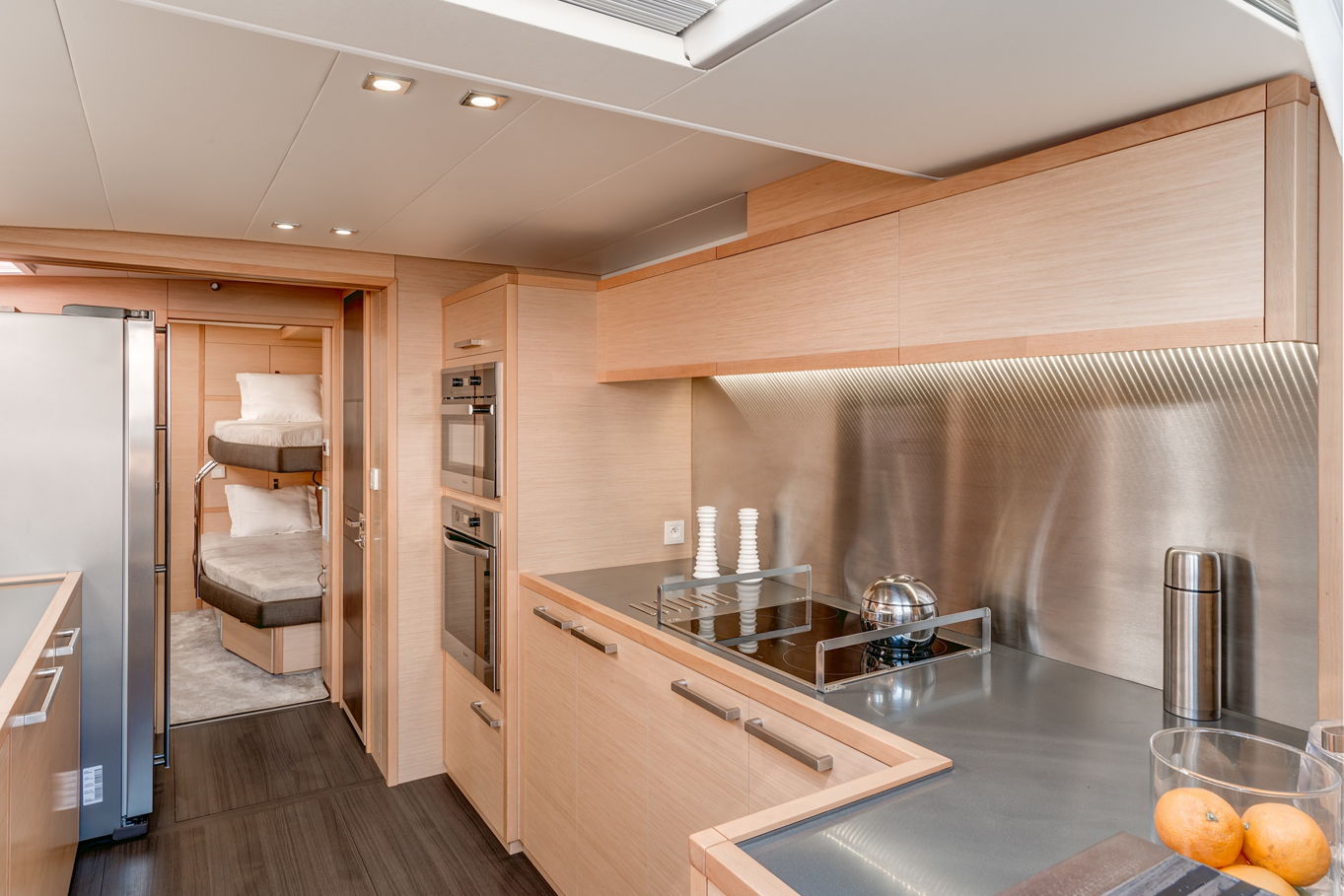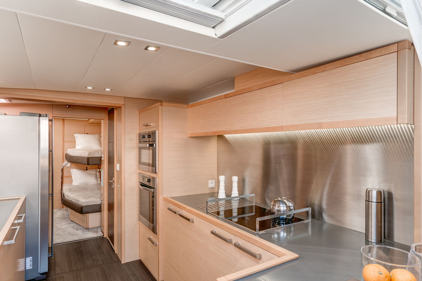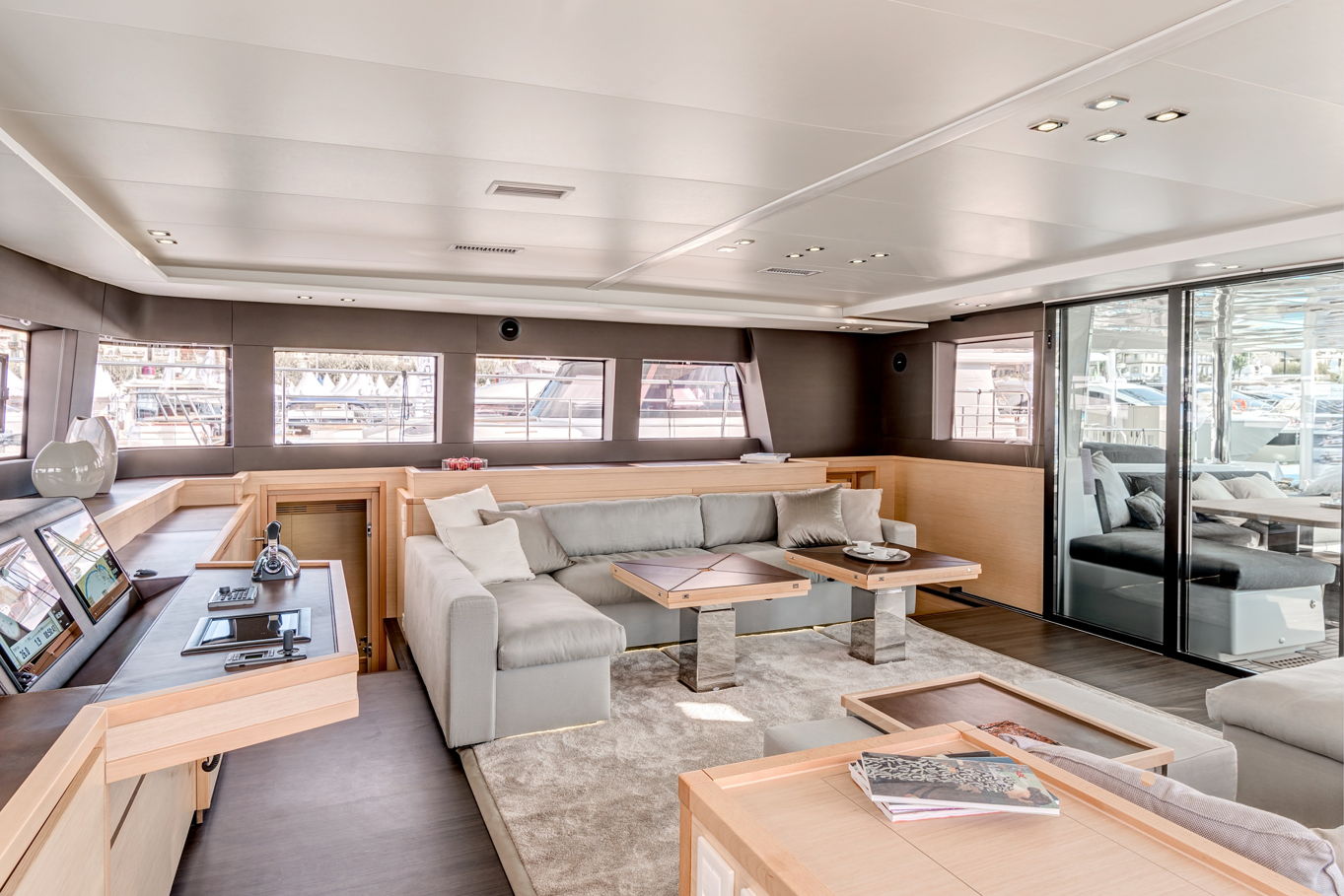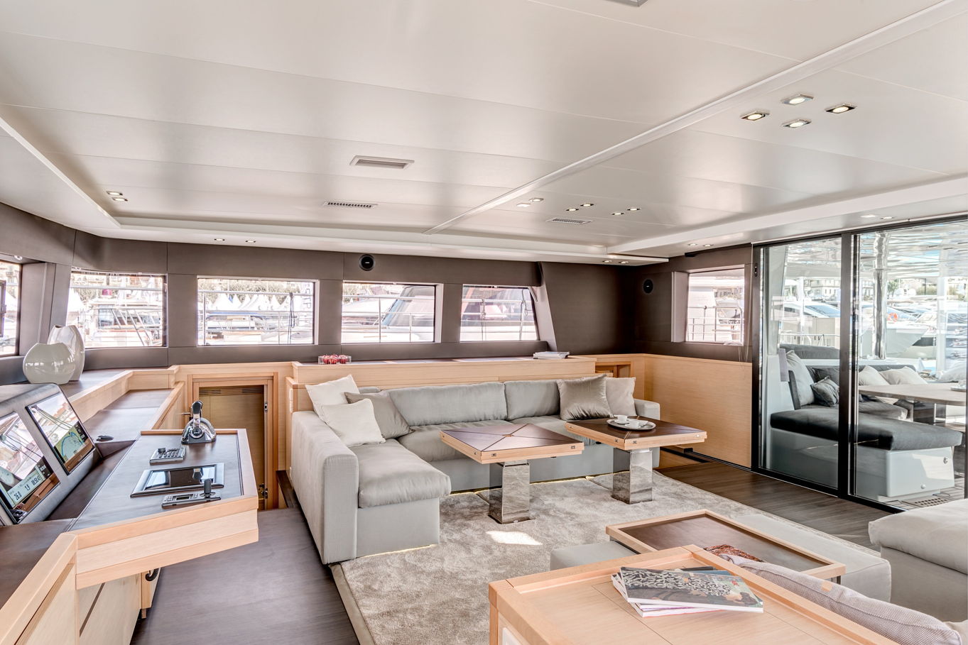 Vzhledem k prostornosti všech kajut překvapí, kolik místa zbylo na velký salon s posezením a kuchyní, který se nachází uprostřed lodi. Kuchyně je plně vybavená pro přípravu všech myslitelných jídel – a právě v salonu můžete relaxovat, než vám hosteska připraví občerstvení dle vašeho přání. Celá loď, jejíž interiér i exteriér je obložen teakovým dřevem, je samozřejmě plně klimatizovaná.