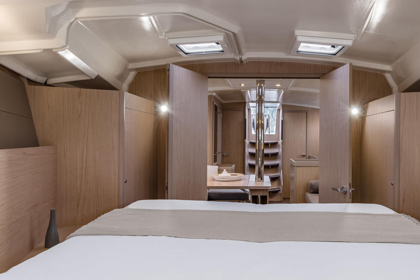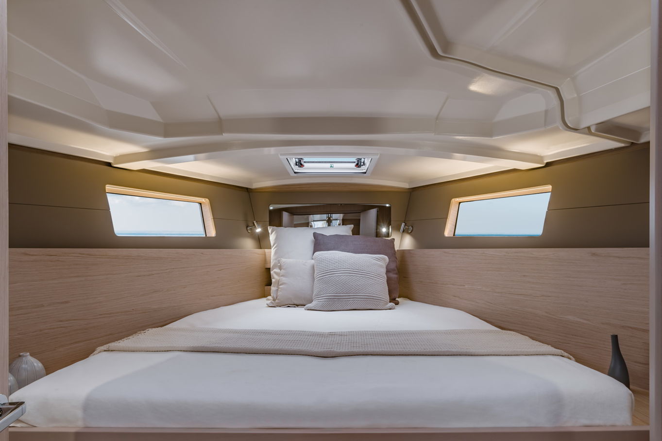 Ve třech dvoulůžkových kabinách se při uklidňujícím houpání na vlnách pohodlně vyspí 6 osob, další dva lidi je možné ubytovat v prostorném společenském salonku. Tento salonek se doslova koupe ve světle, a právě díky velkému množství oken nabízí odkudkoli úchvatný výhled ven.