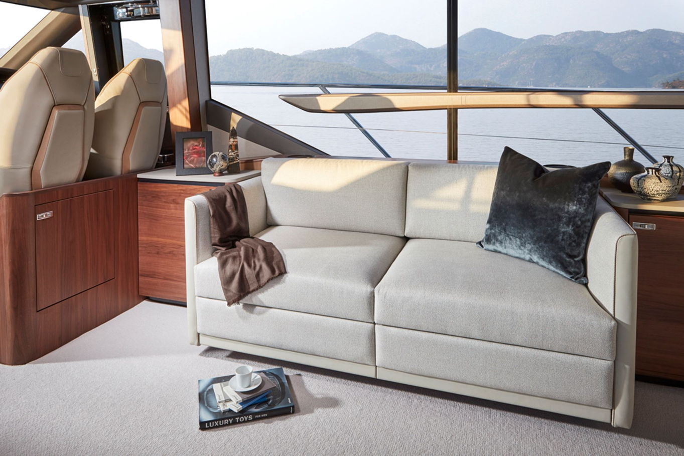 Pohodlná posezení najdete samozřejmě tradičně i na zádi lodi a na zastřešené horní palubě. Na takzvané flybridge jsou k dispozici i opalovací podložky a barbecue. Právě odtud se nabízí nejkrásnější výhled na moře i pobřeží.