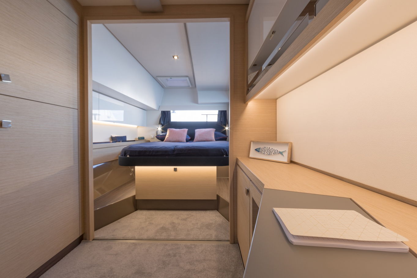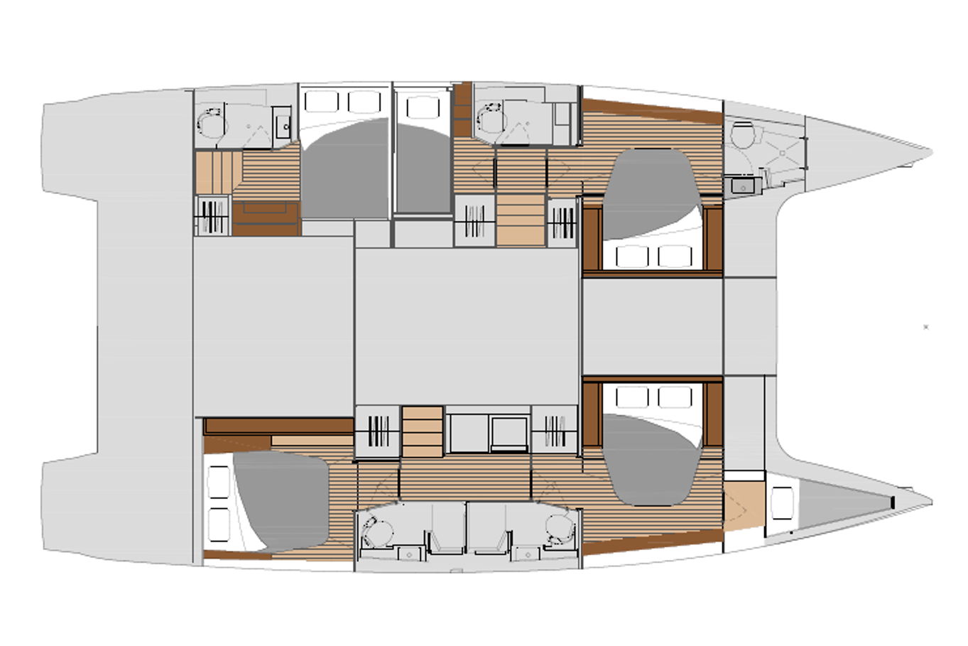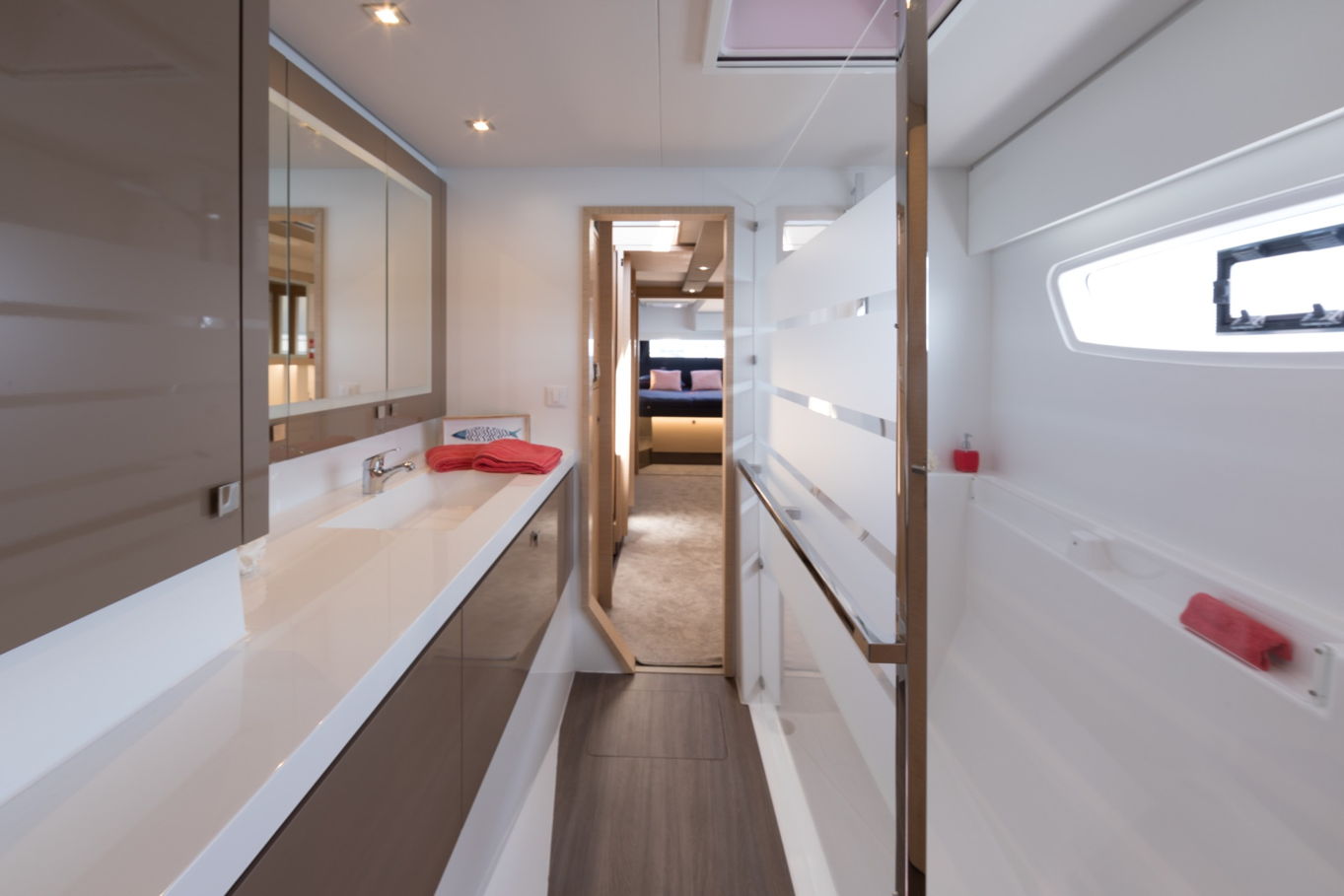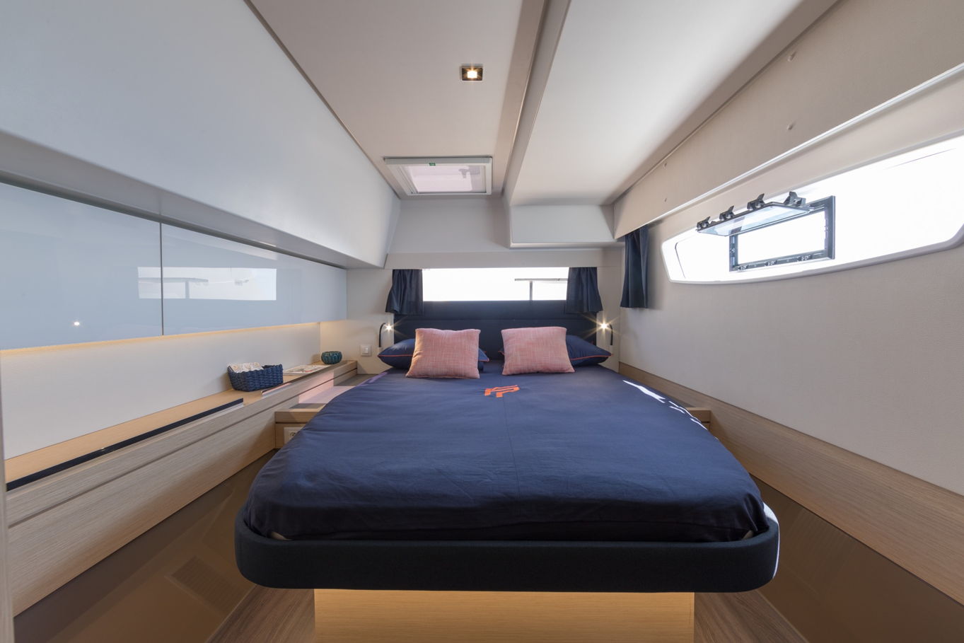V kajutách se kombinuje prostor a elegance. Každá z 5 kajut má také svoji vlastní koupelnu pro vaše nerušené soukromí. Čtyři z pěti kajut mají dvoulůžkové postele, poslední, pátá kajuta má patrovou postel, ideální pro děti.