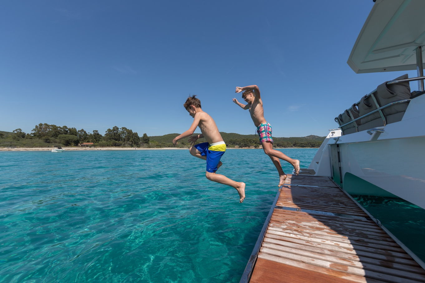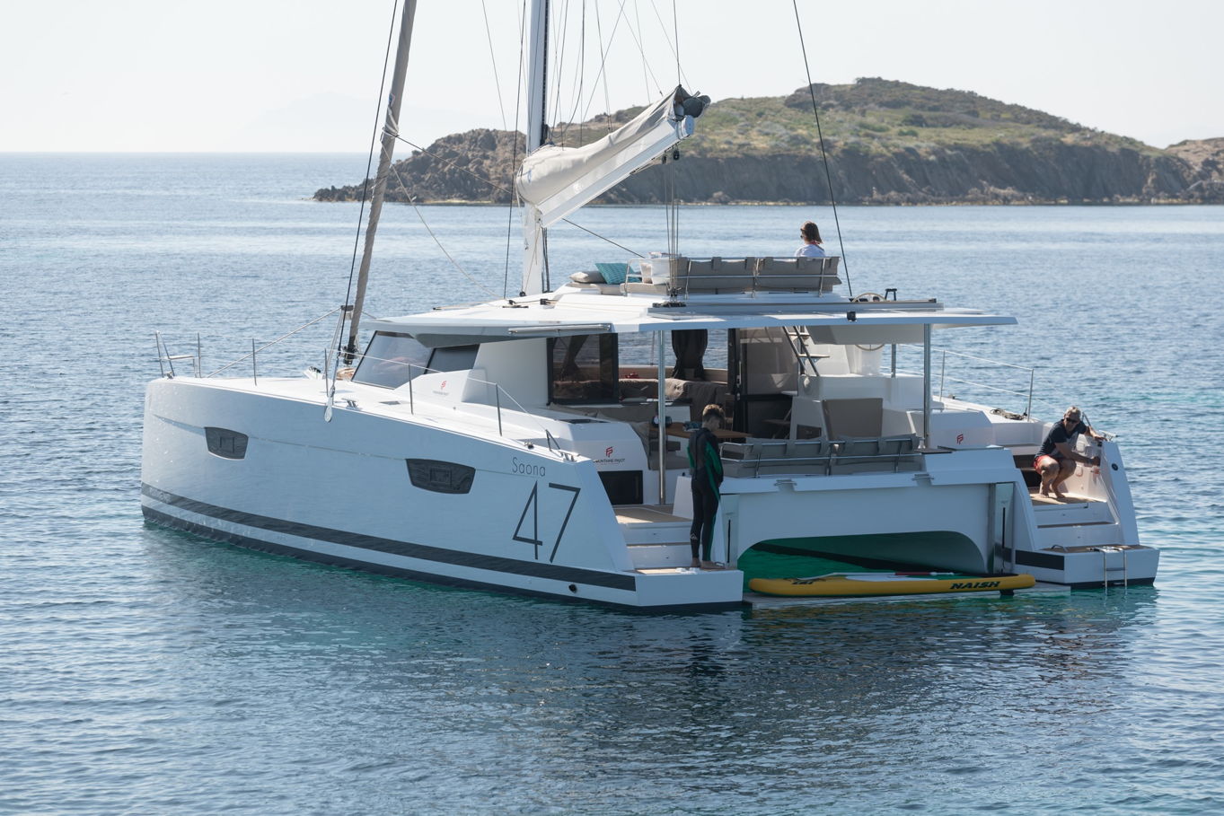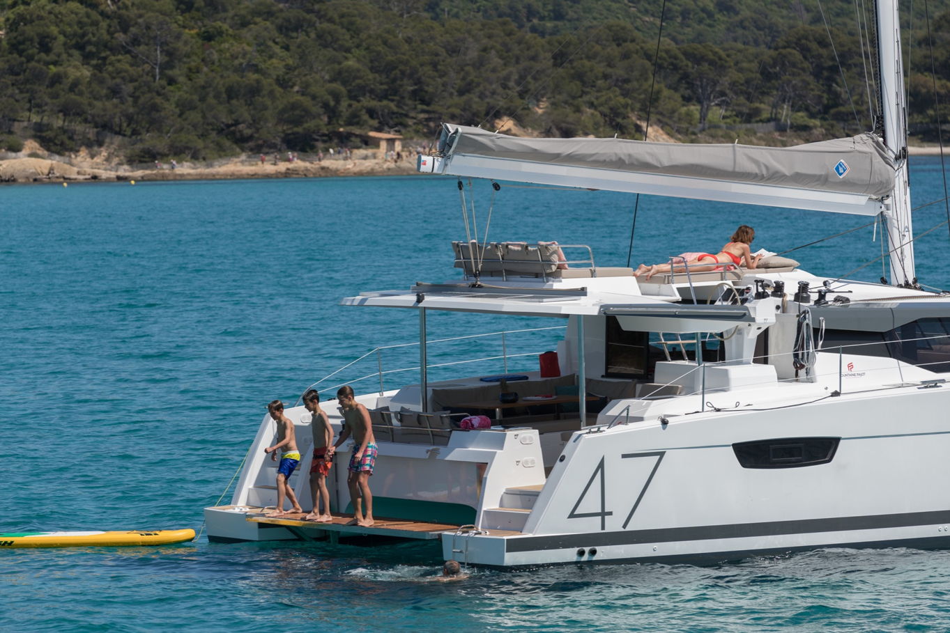 I přístup do vody je tu velice pohodlně vyřešen. Na zadních plovácích máte k dispozici schůdky pro mírný přístup. Nic vám ale nebrání v tom, skočit do vody šipku jak ze zádi, tak z boků lodi. Dámy také jistě ocení opalovací lehátka na střeše salonu, kde zachytí nejvíce slunečních paprsků a které také nabízejí nejkrásnější výhledy.