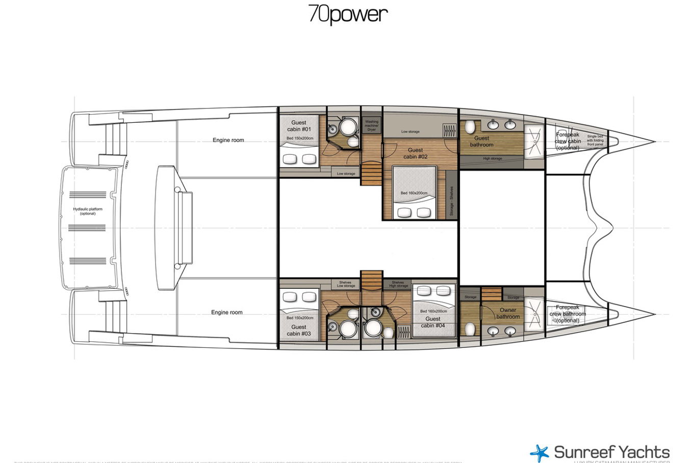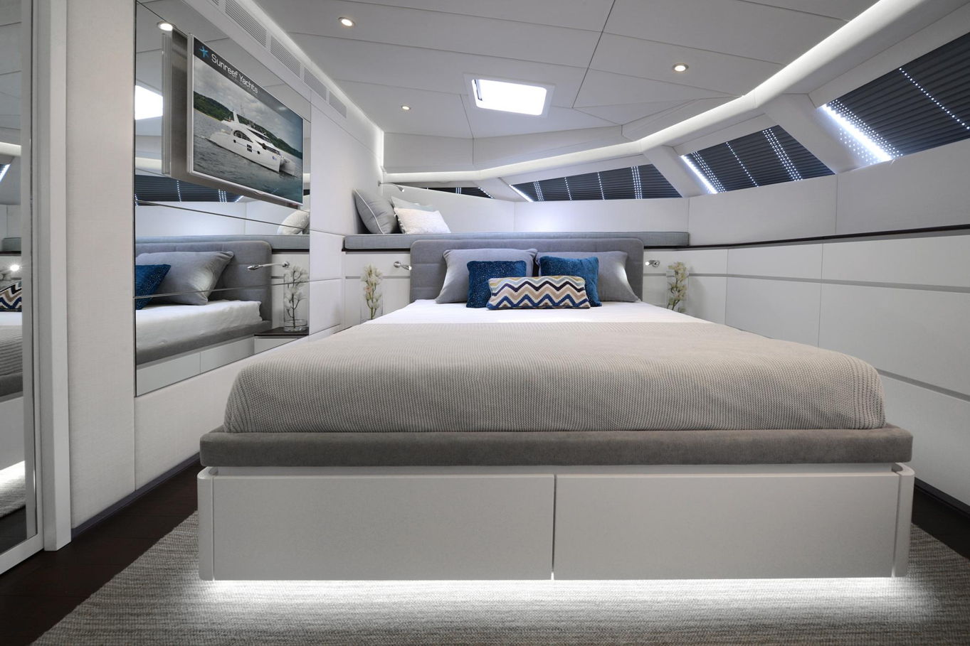 Na přídi lodi se nachází velká kapitánská kajuta s dvoulůžkovou postelí, prostornými úložnými místy i posezením. V podpalubí jsou k dispozici i tři další dvoulůžkové kajuty s vlastními koupelnami, takže loď pojme celkem 8 osob. Všechny kabiny jsou samozřejmě luxusně vyzdobené a nabízejí dostatek úložných prostorů.