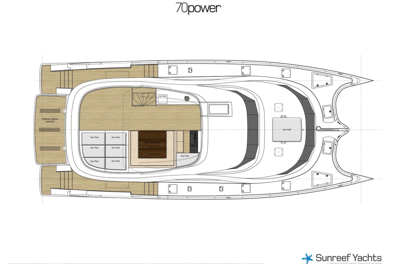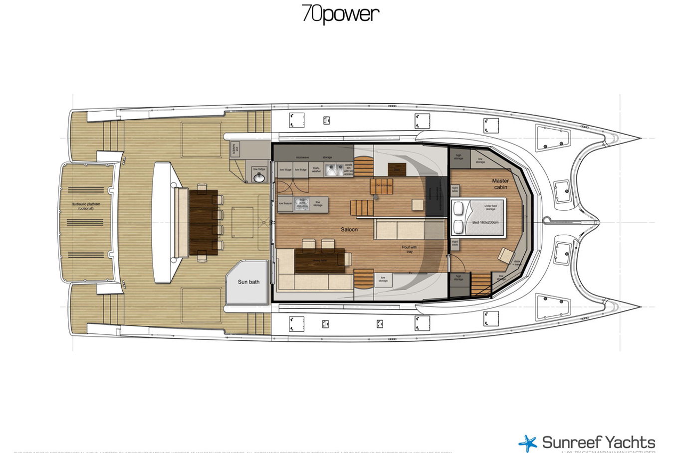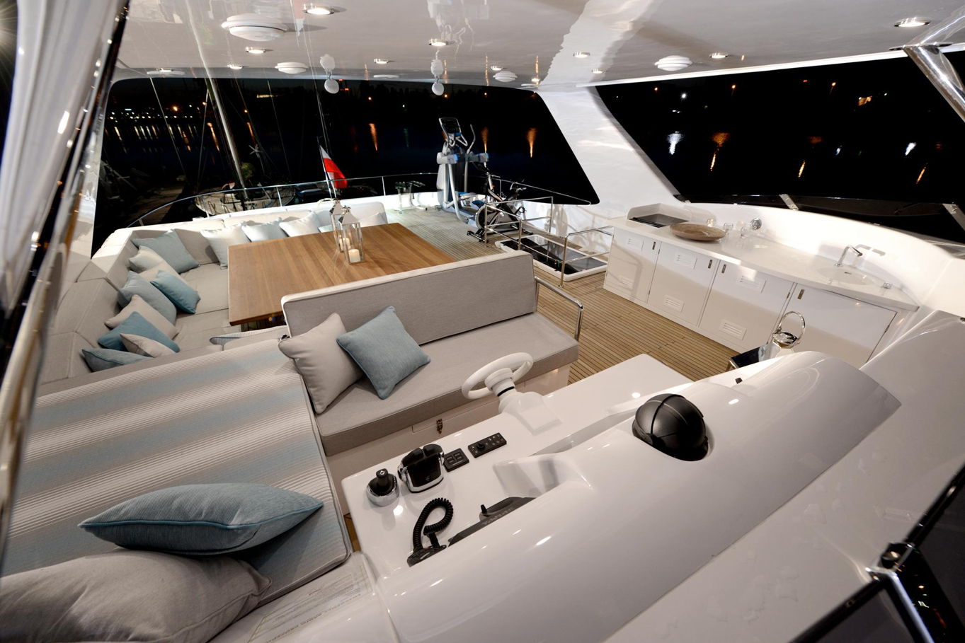 V rozlehlém a výjimečně vybaveném salonu je jídelní kout, plně vybavená kuchyň a bar. Na salon plynule navazuje záď lodi, na které je k dispozici pohodlné a moderní posezení. Nejoblíbenější částí lodí je ale bezesporu horní paluba – důvodem je nejen fantastický výhled, ale i špičkové vybavení umožňující relaxaci po dni stráveném na slunci nebo poznáváním přímořských městeček. Najdete tu pohodlné posezení, jacuzzi pro 4 až 5 osob s vyhřívanými sedačkami a sprchou, karaoke s vysoce kvalitním audio zařízením, disco světla i 50palcovou vodotěsnou televizi. Pod zvedacím schodištěm je navíc ukryta speciální garáž pro potápěčské vybavení a vodní sporty.